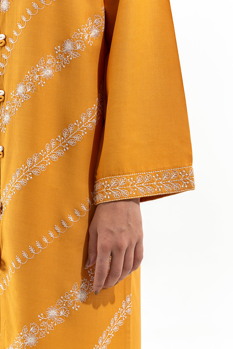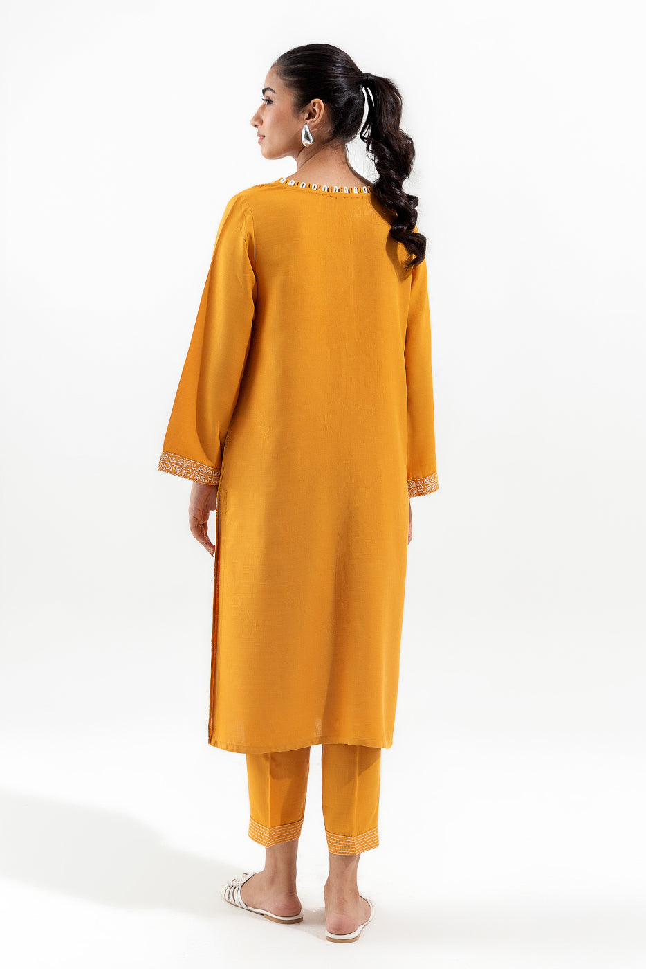 - Description: Embroidered Two Piece Set With Shirt Having A Boat Neckline With Loop Details On It, Paired With Pants Having Embroidered Bottom.