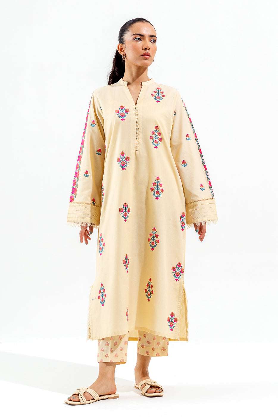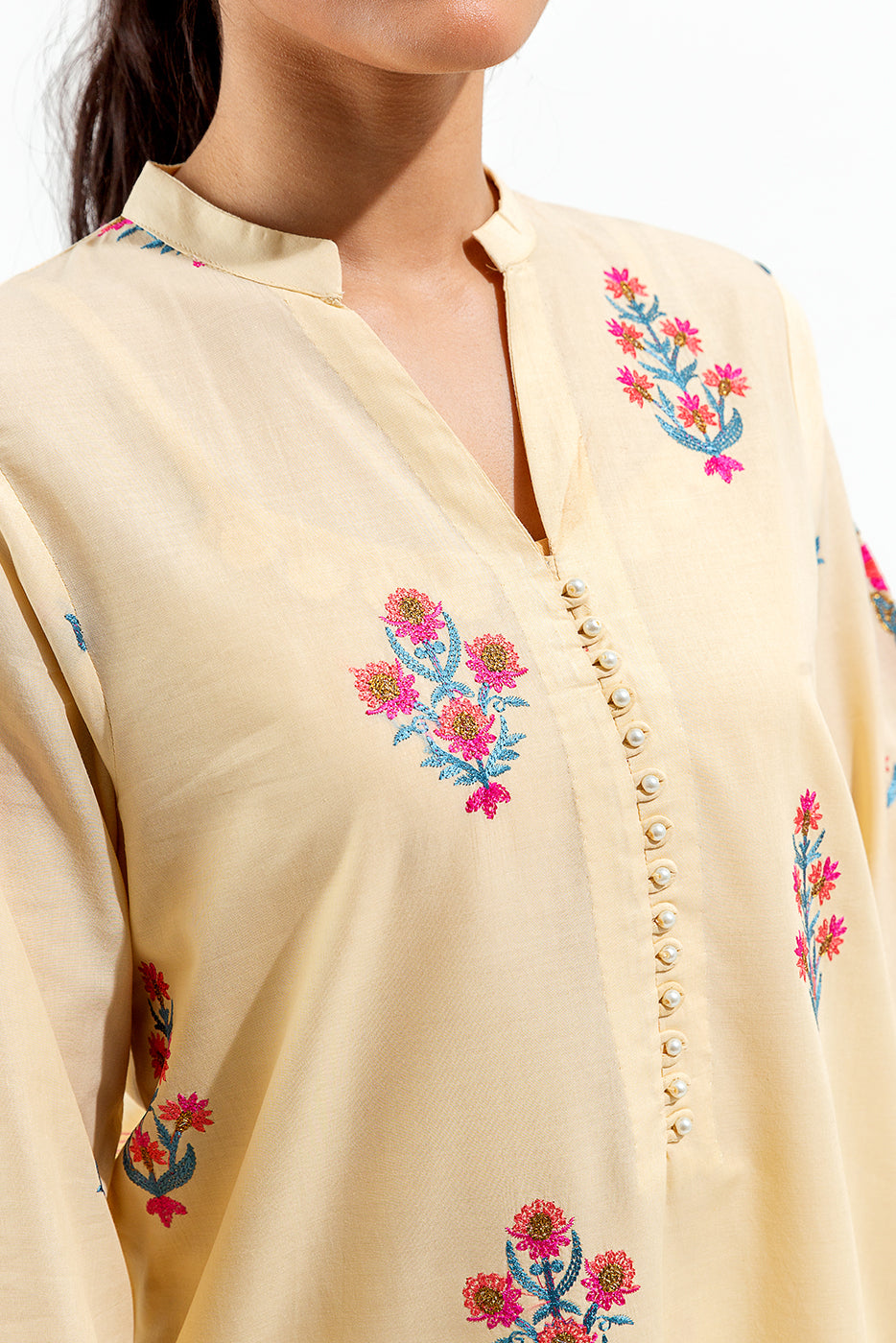 - Description: Basic Embroidered Shirt With Band Collar And V-Neckline With Placket And Buttons Detail, All Over Embroidered Motif Spray On Front And Sleeves With Frayed Edging Detail. Paired With Printed Pants To Complete The Look.