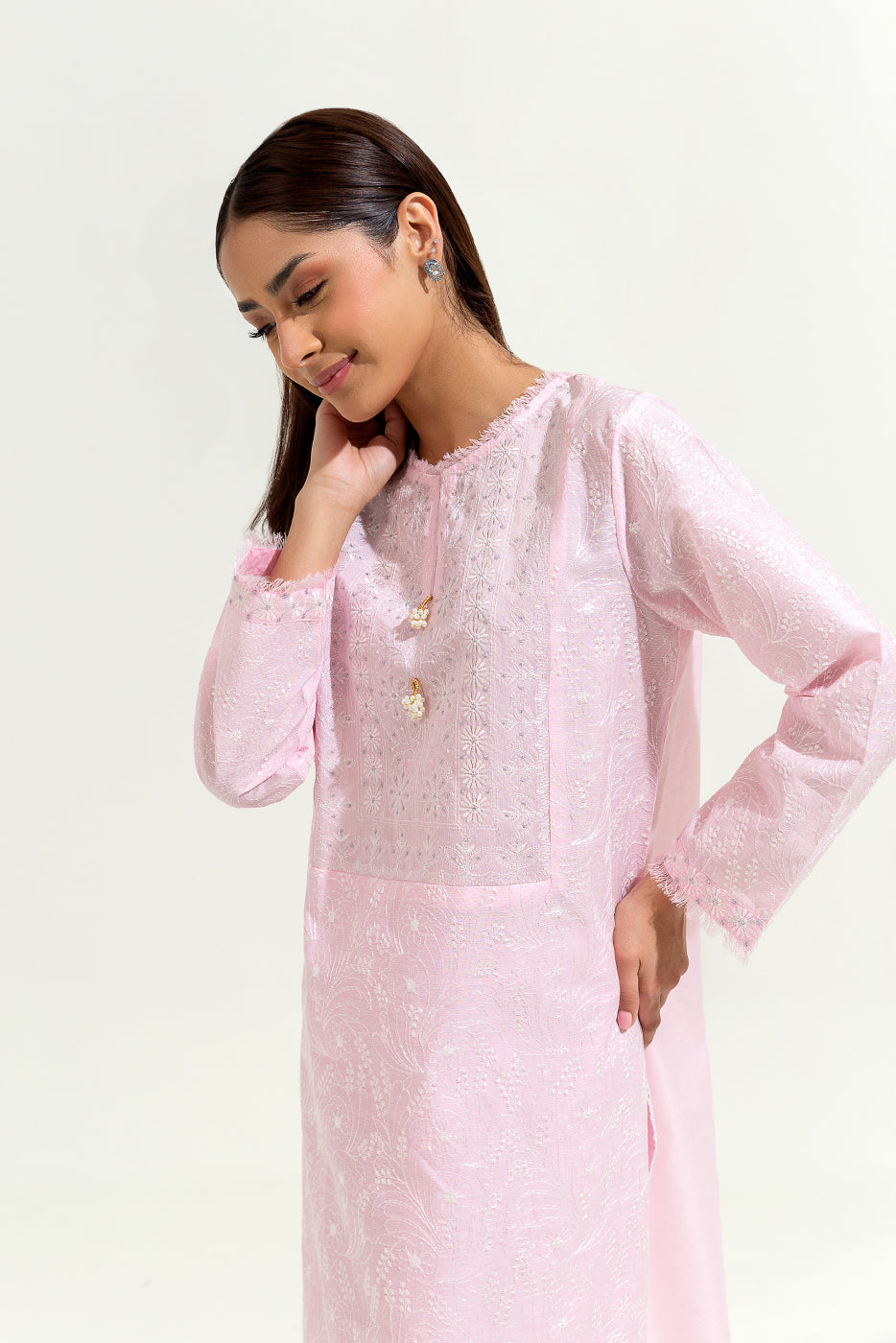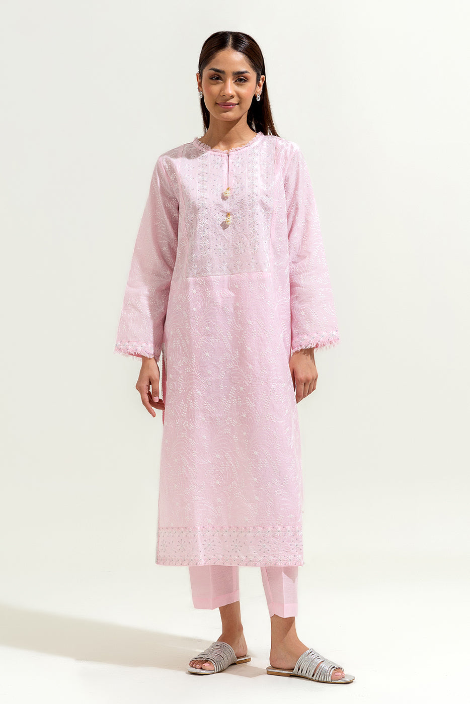 - Description: Basic Embroidered Shirt With Round Neckline And Slit With Placket With Handwork Detail, All Over Chickenkari Embroidery On Front And Sleeves With Lace And Frauyed Edging Detail. Paired With Straight Pants To Complete The Look.