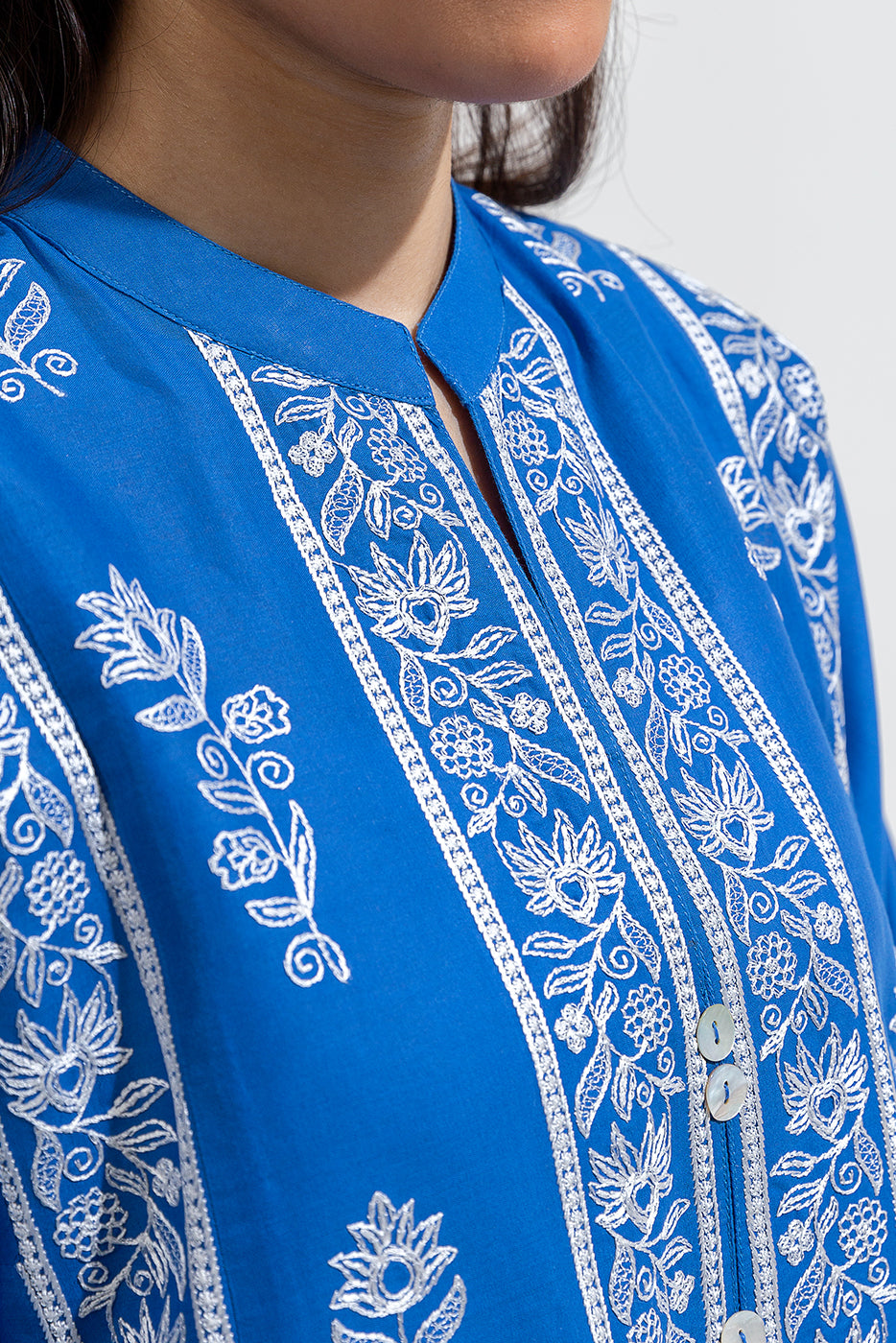 - Description: Embroidered Two Peice Set. A-Line Shirt With Unique Embroidery Paired With Hem Embroidered Slack Pants.