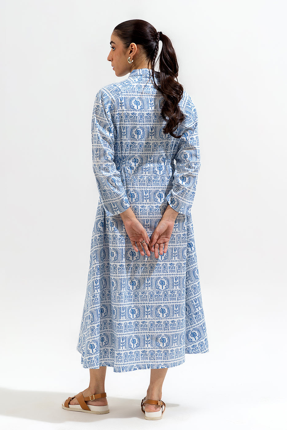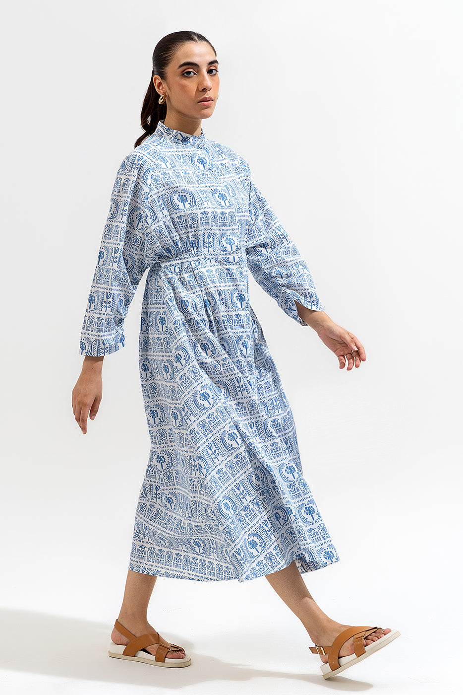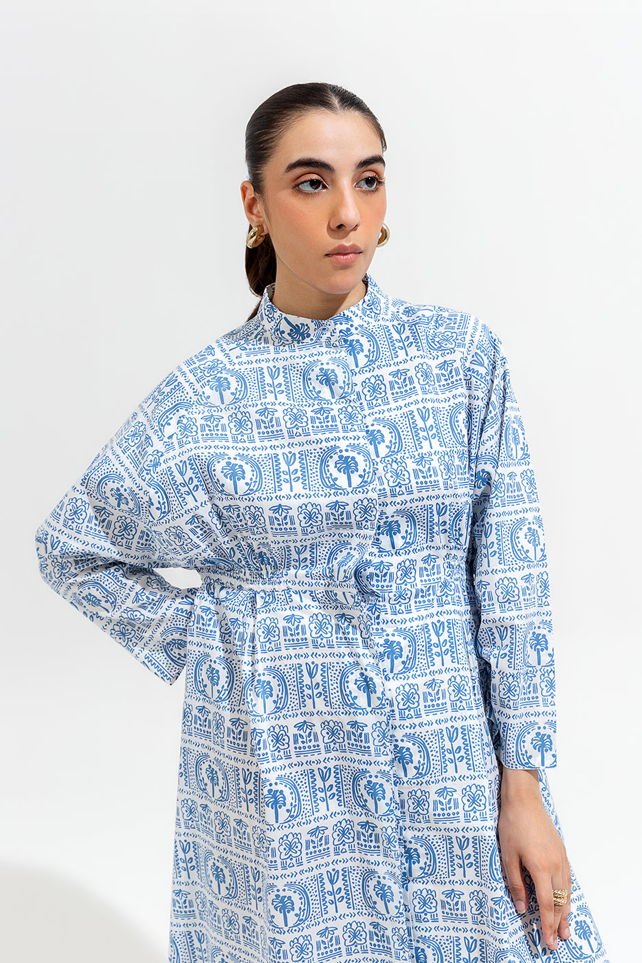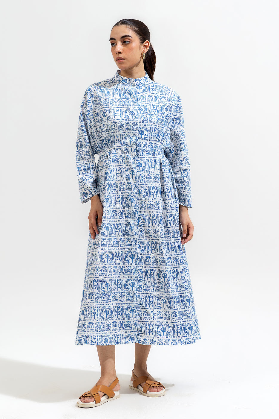 PRINTED LONG BAND COLLAR DRESS