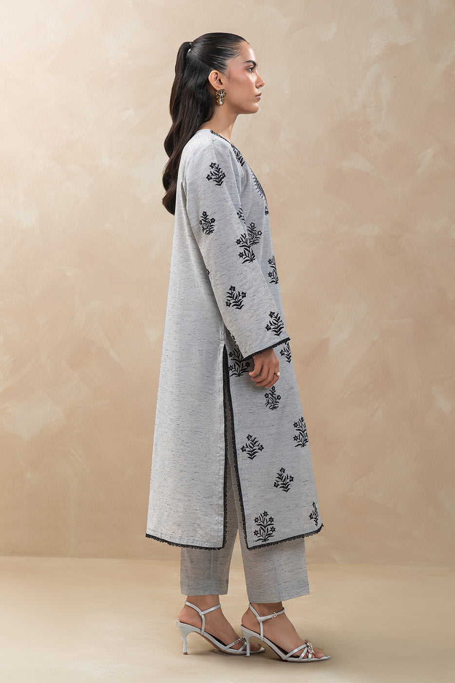 - Description: Embroidered Shirt With Roind Neck And Slit.Paired With Straight Pants.