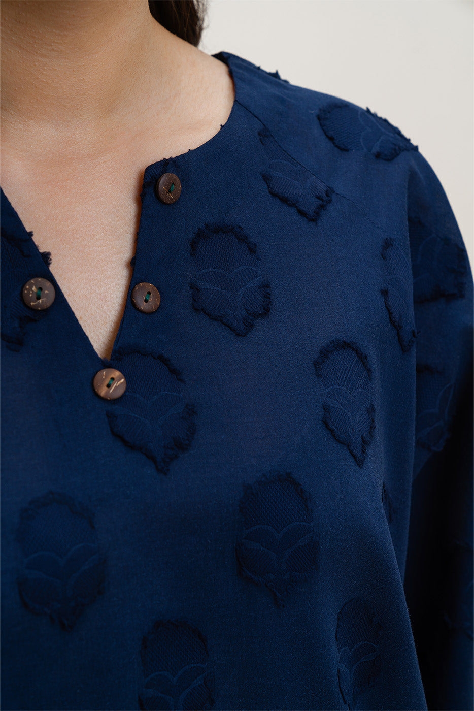 - Description: Jacquard Loose Fit Shirt With Handwork Detail On Neckline Paired With Culottes.