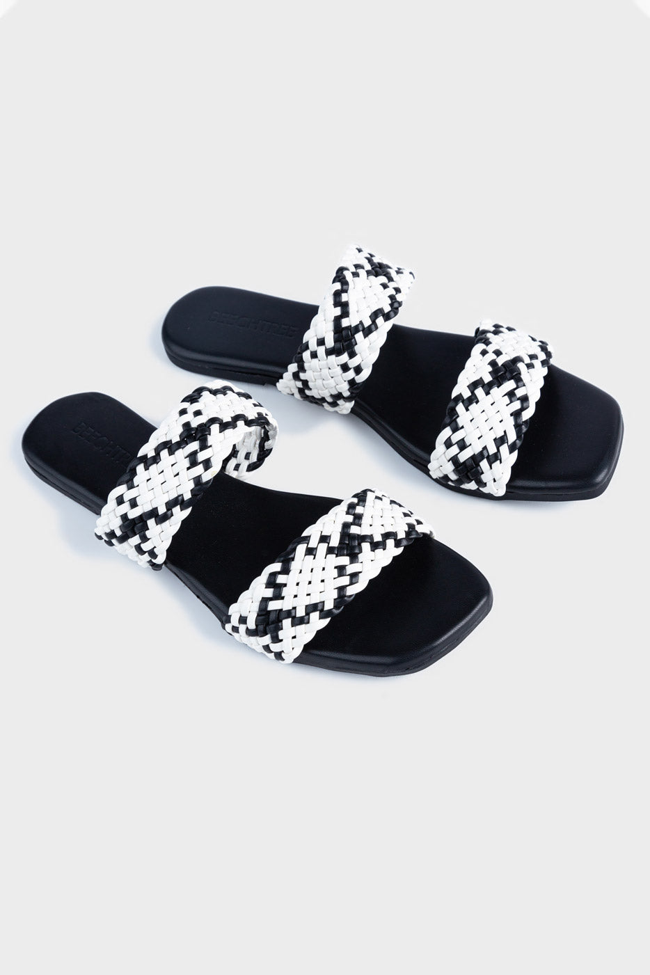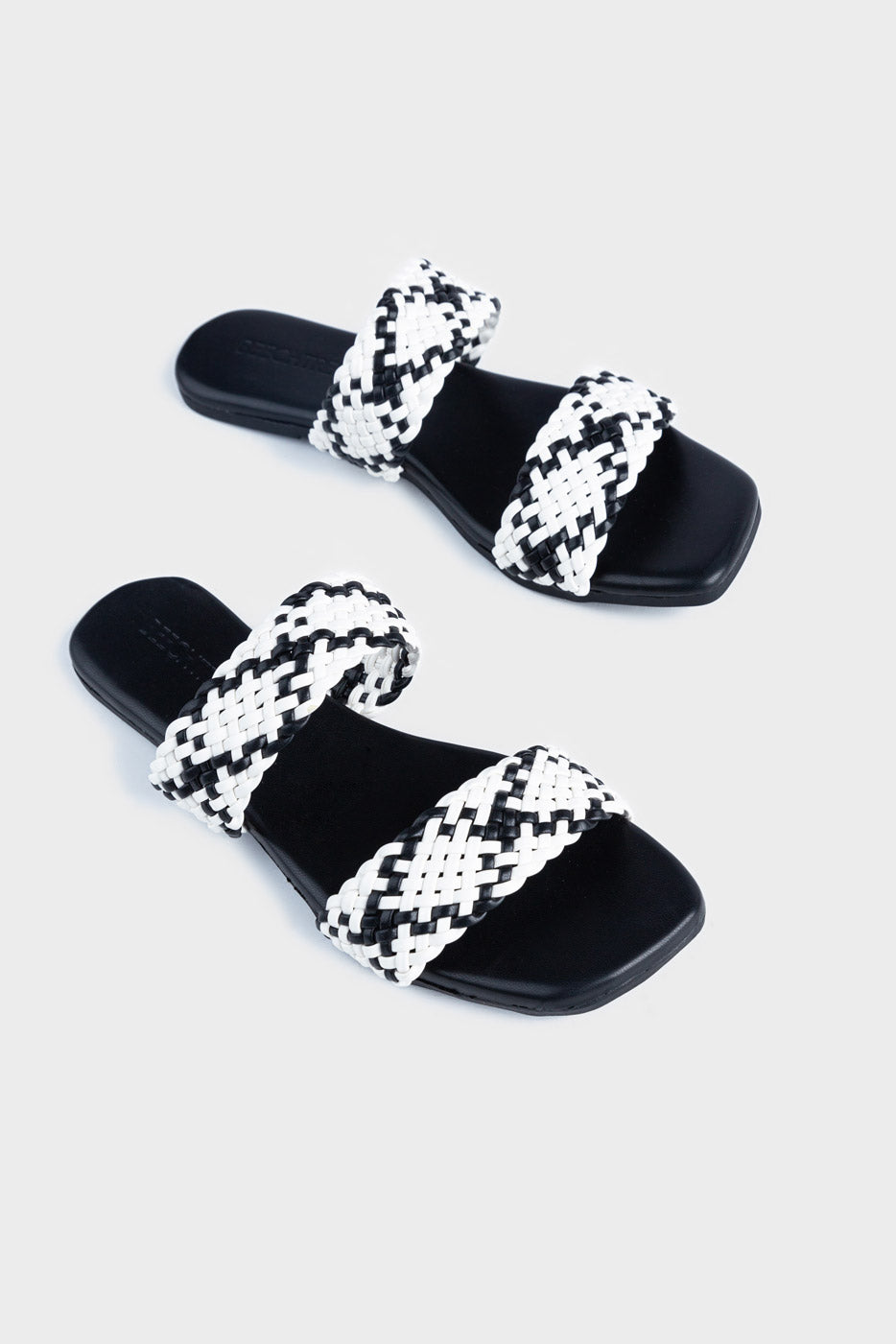 Make a bold statement with these striking monochrome double-strap slide sandals. Featuring a sleek black sole and intricately woven black-and-white braided straps, this design combines classic contrast with a modern edge. The dual-strap construction offers secure comfort, while the square toe silhouette adds a fashion-forward touch. Perfect for pairing with anything from casual jeans to flowy dresses, these sandals are your go-to choice for a chic, contemporary look.