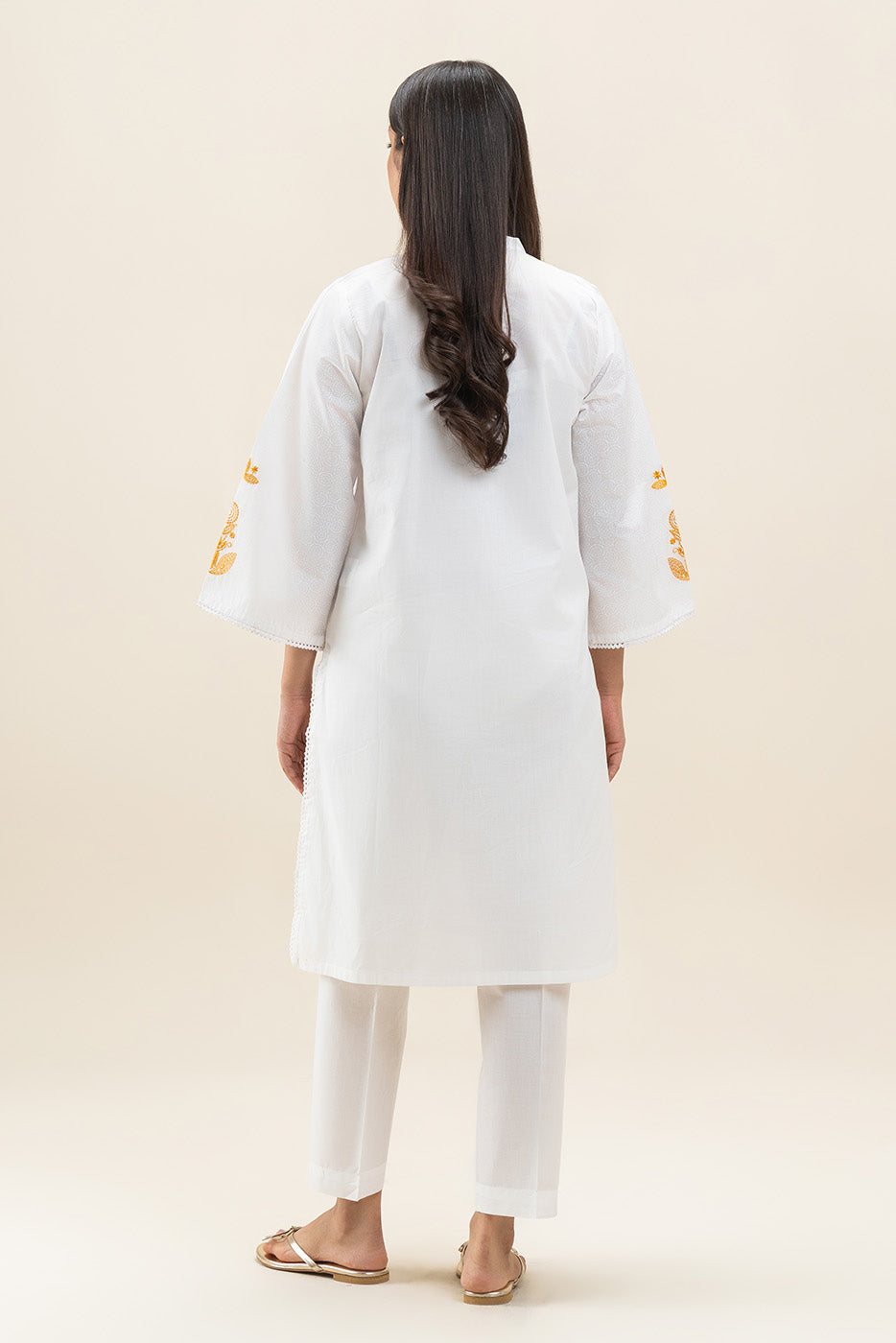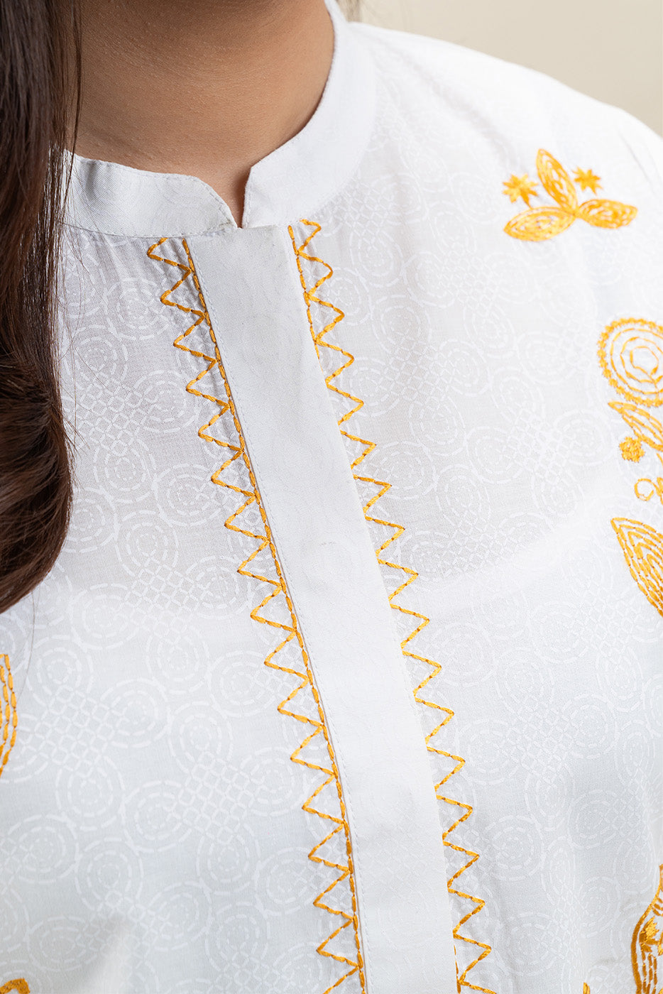 - Description: Screen Printed Shirt With Embroidery On Front Yoke And Sleeves, Band Collar And Double Placket With Lace Detail On Front And Sleeves. Paired With Straight Pants To Complete The Look.