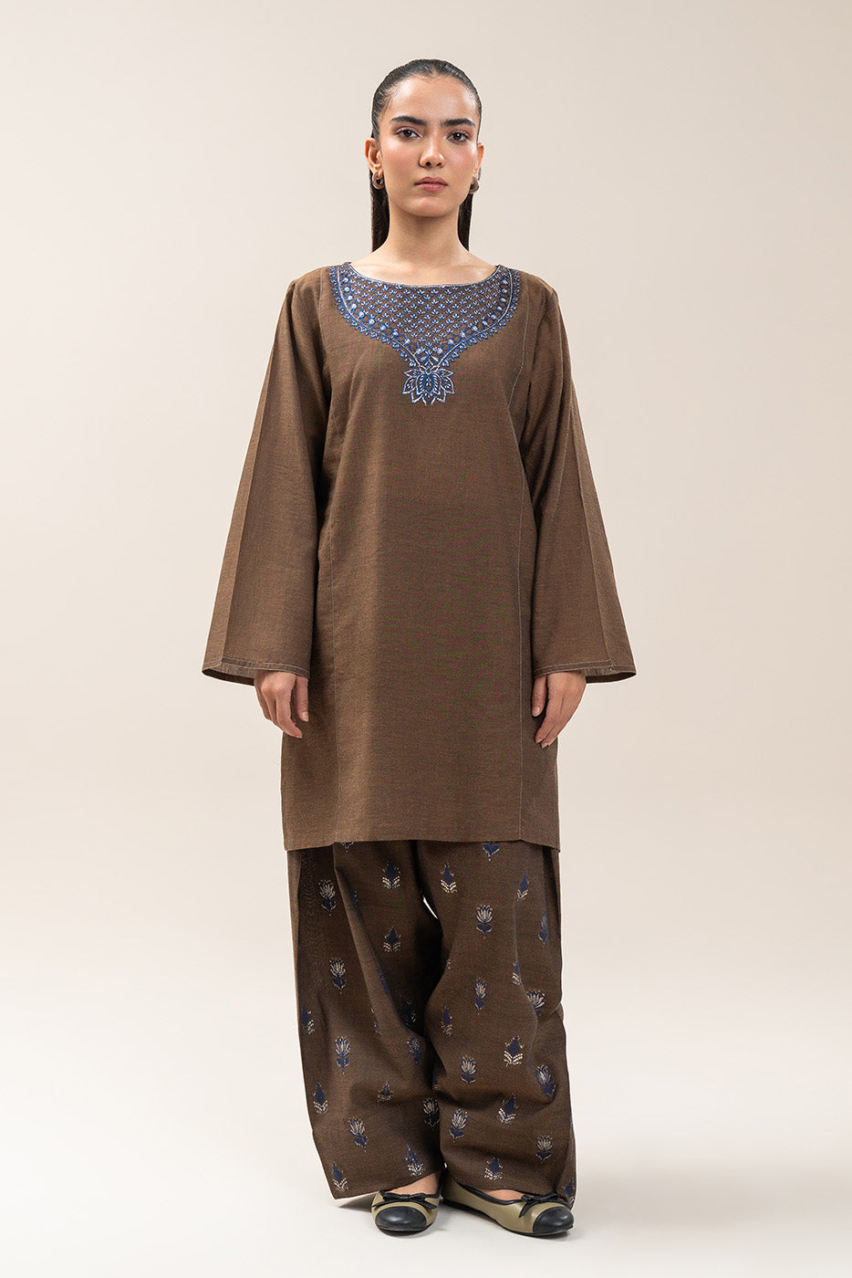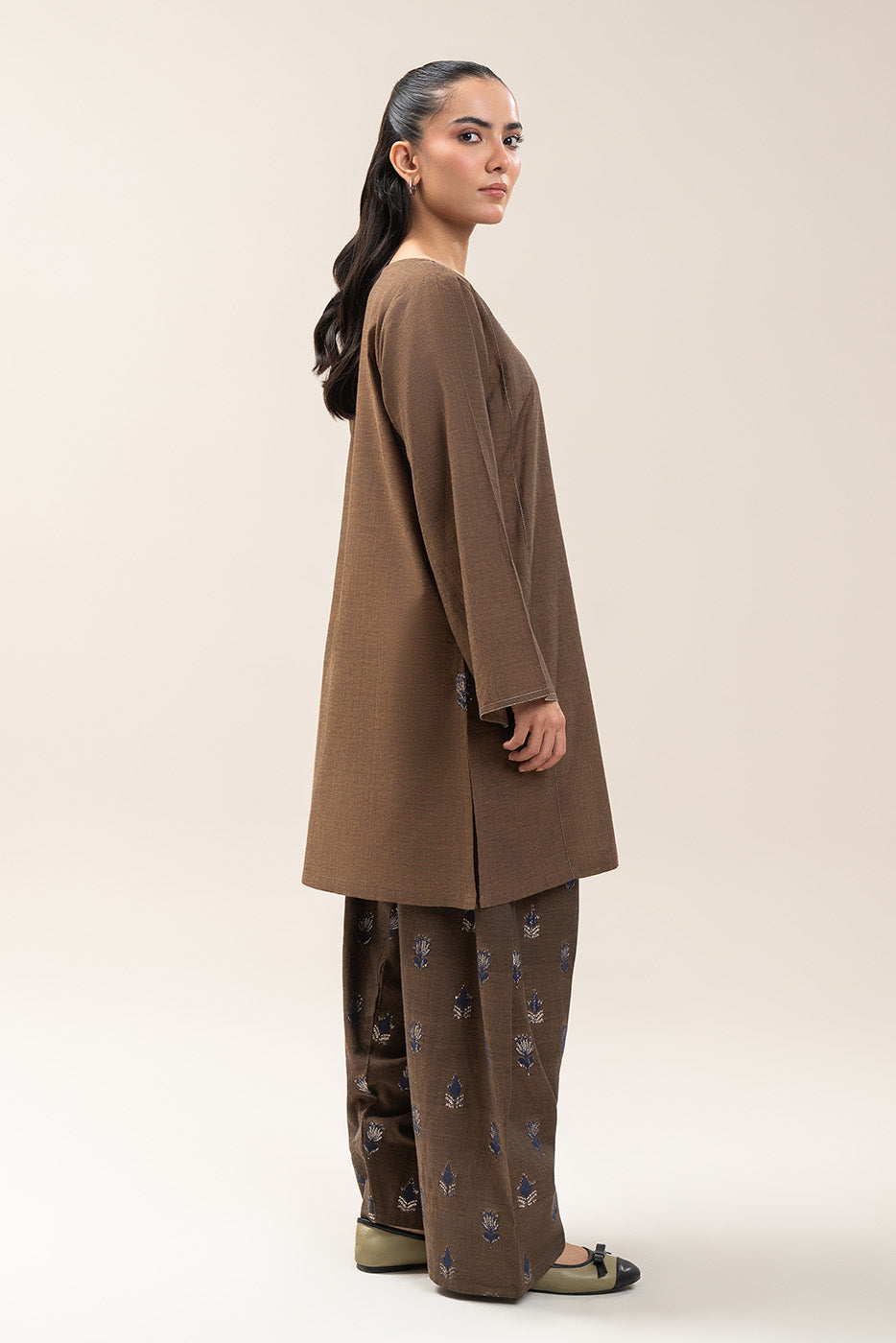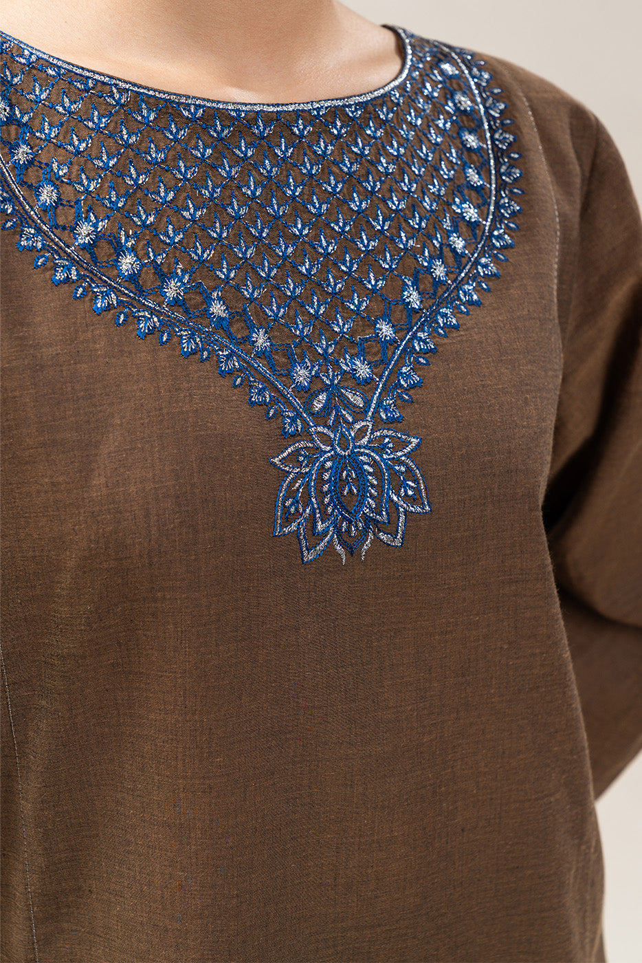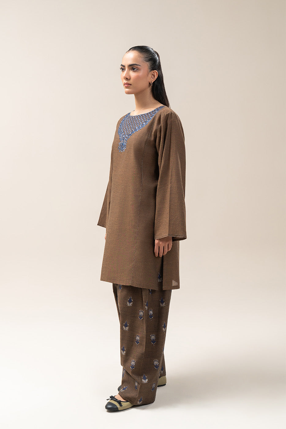- Description: Embroidered Shirt With Round Neckline And Top Stitches Detail On Front And Sleeves And Jacquard Motif Patched On Side Seams. Paired With Loose Jacquard Shalwar To Complete The Look.