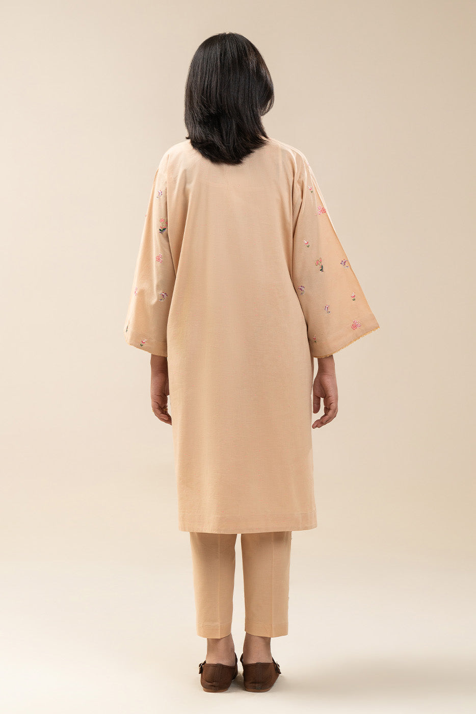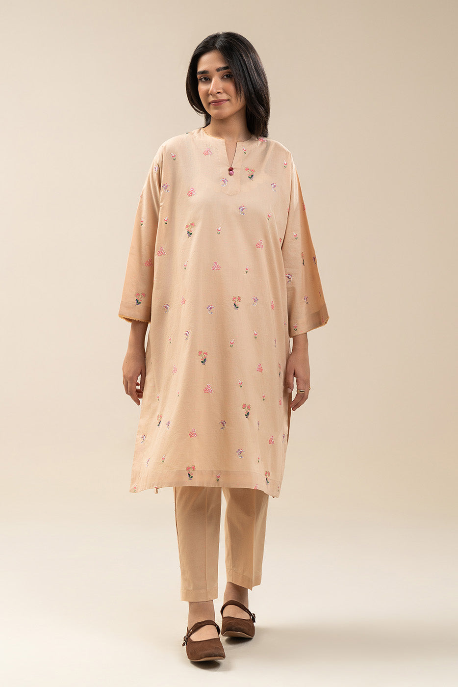 - Description: Embroidered Shirt With Round Neckline And V-Slit With Frayed Edging Detail And Buttons, All Over Embroidered Motif Spray On Front And Sleeves. Paired With Straight Pants To Complete The Look.