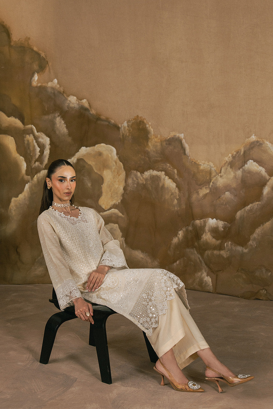 - Description: Elegant beige 2-piece set featuring intricate white embroidery on a straight shirt paired with matching trousers for a timeless, graceful look.