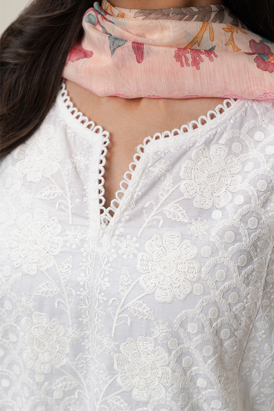 - Description: Embroidered Shirt With Round Neckline And V-Slit With Lace Insert, All Over Embroidery And Organza Border Detail On Front Hem With Laces Inserts On Front And Sleeves. Paired With Loosefit Straight Pants And Digital Printed Dupatta To Complete The Look.