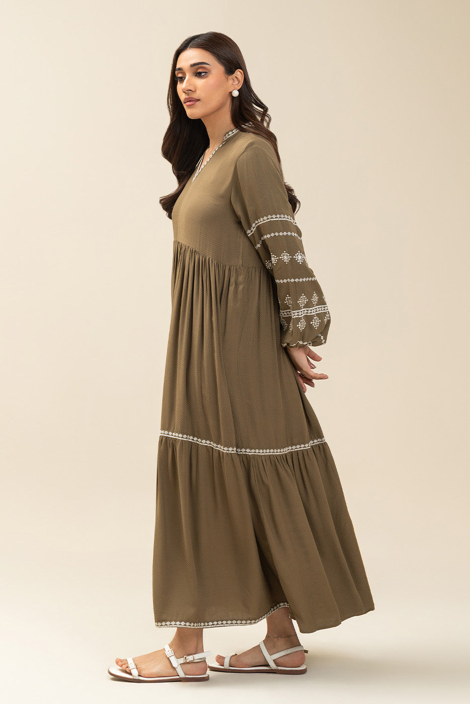 Tiered Dress With Atec Embroidery On Front And Sleeves.