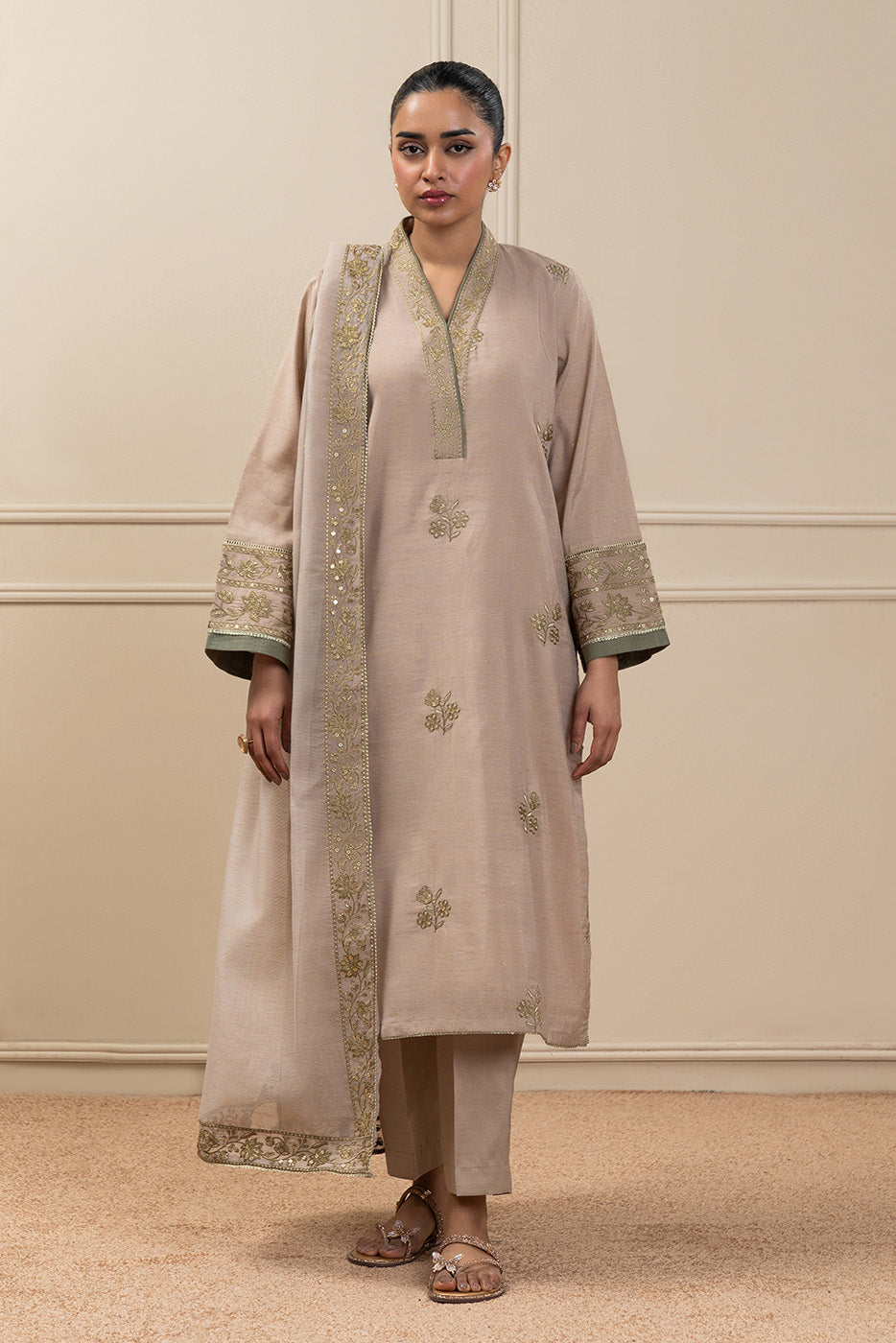 3 PIECE EMBROIDERED GOLD ZARI SUIT (HIGH CASUAL)