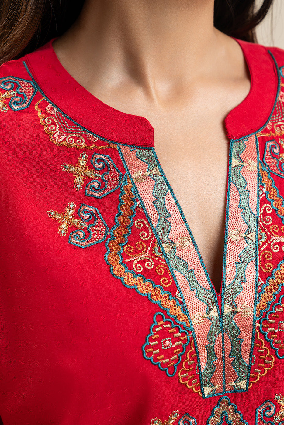 - Description: Embroidered Shirt With Band Neckline Paired With Culottes.