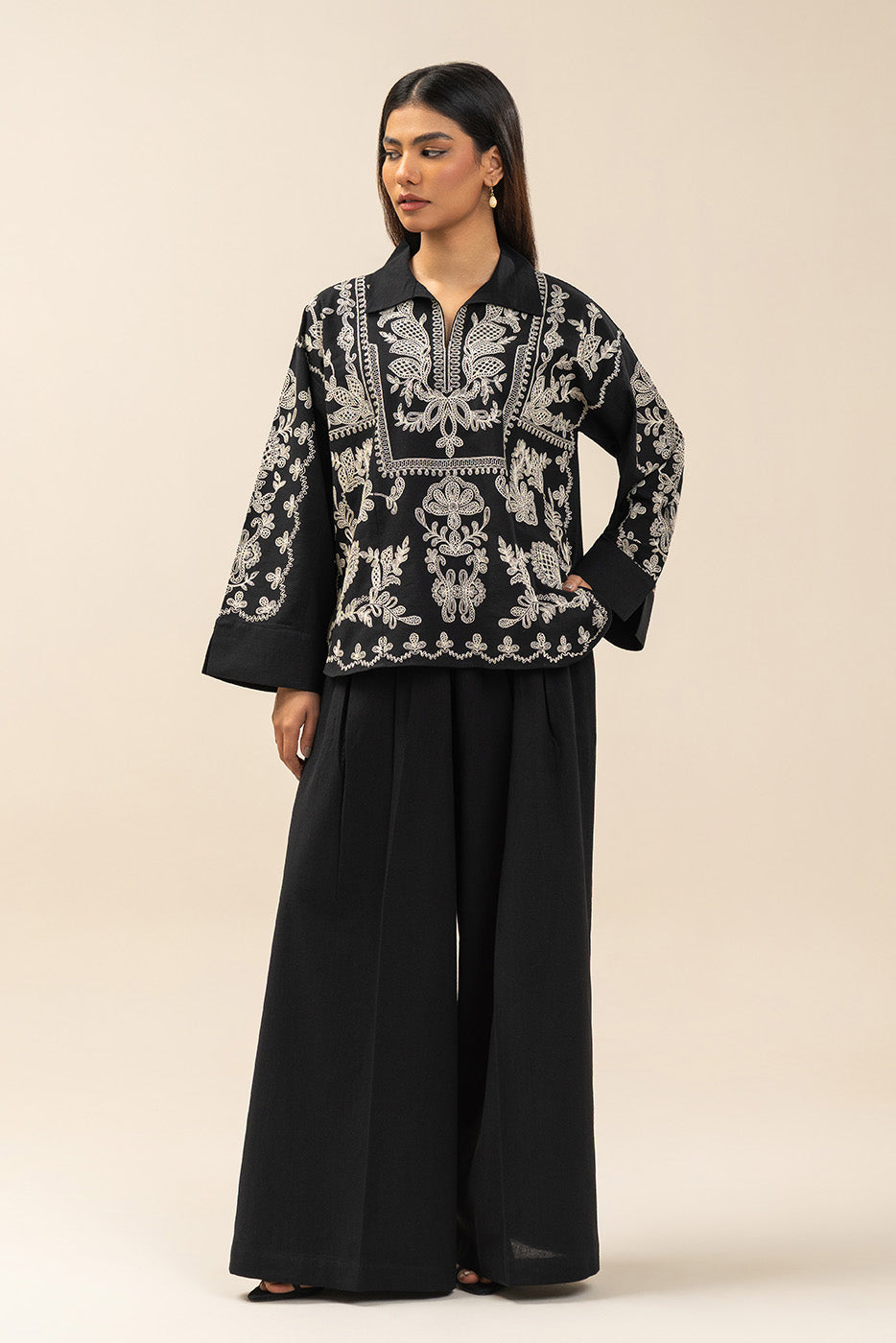 - Description: Embroidered Fusion Set With Pleated Pants.