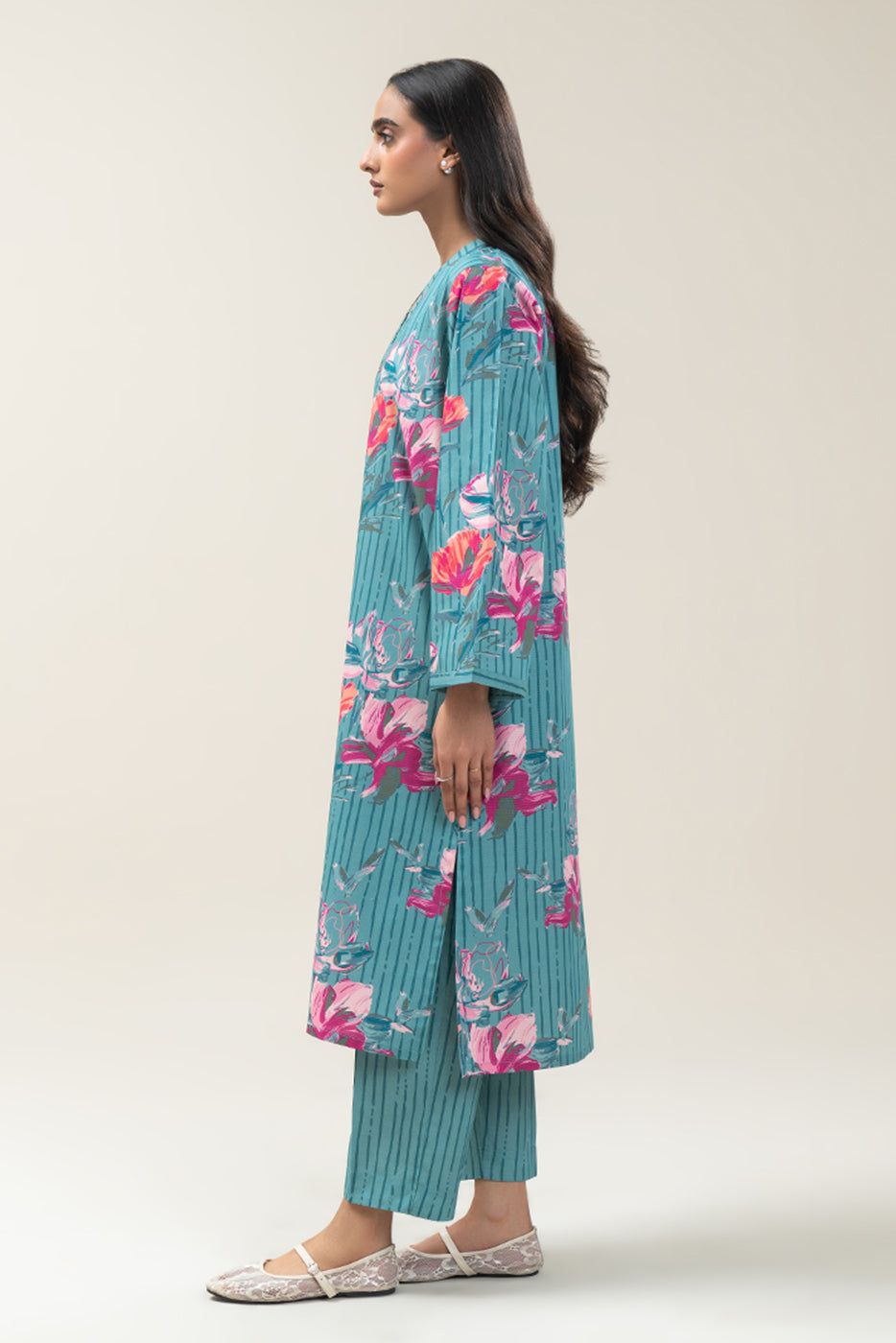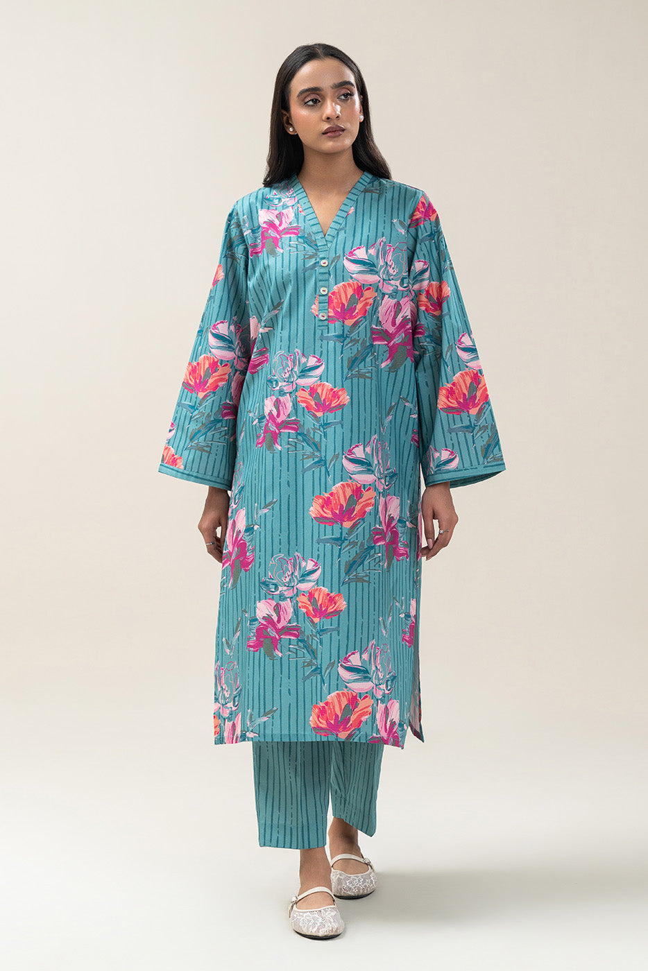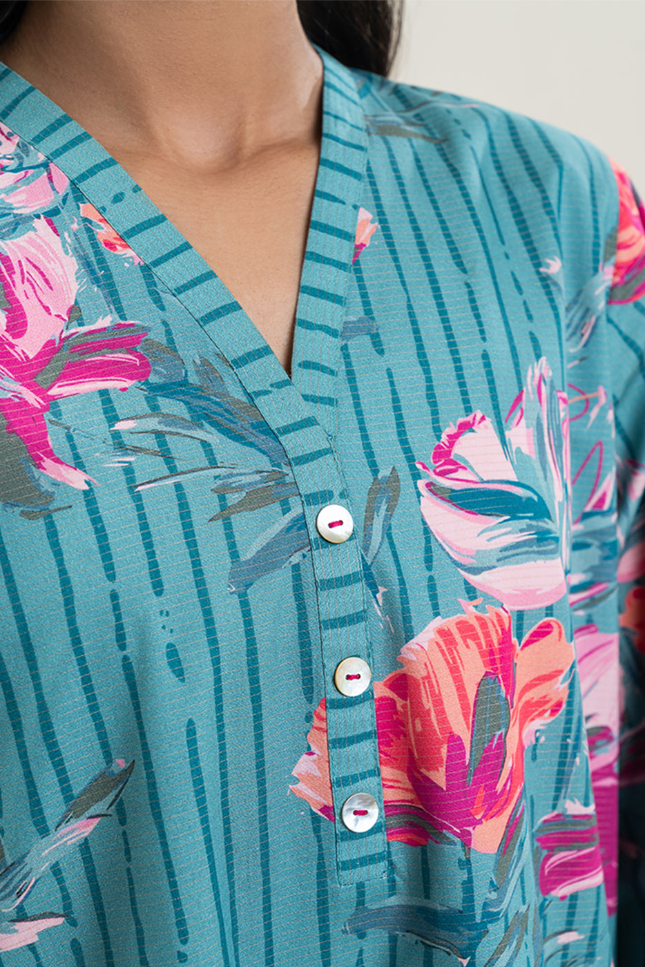 - Description: 2Pc Printed Shirt With Button Detail On Neckline Paired With Printed Straight Trouser.