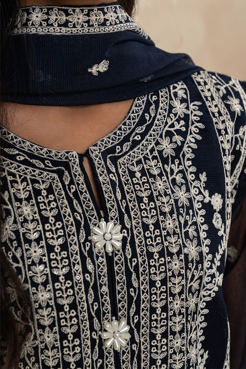 - Description: 3 pc embroidered set with round neck shirt and hand work detail . Embroidered sleeves with accent borders paired with embroidered dupatta and plain pants.