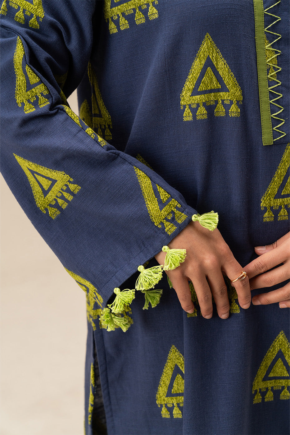 - Description: 2-piece set featuring a printed kurta with neon geometric patterns and pom-pom detailing, paired with matching trousers.