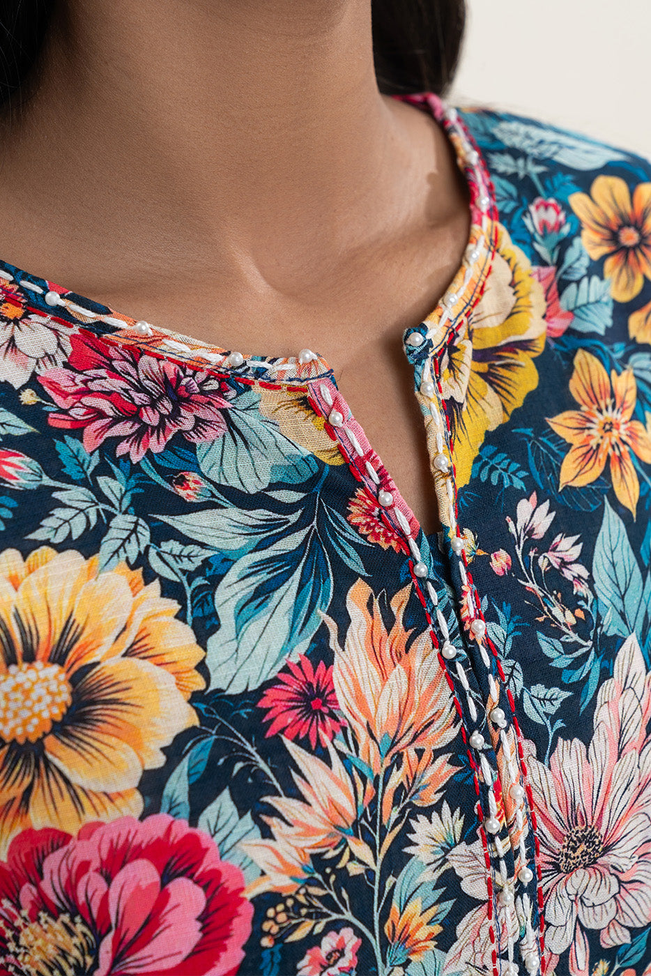 - Description: Digital Printed Long Length Shirt With Handwork On Neckline Paired With Culotte.
