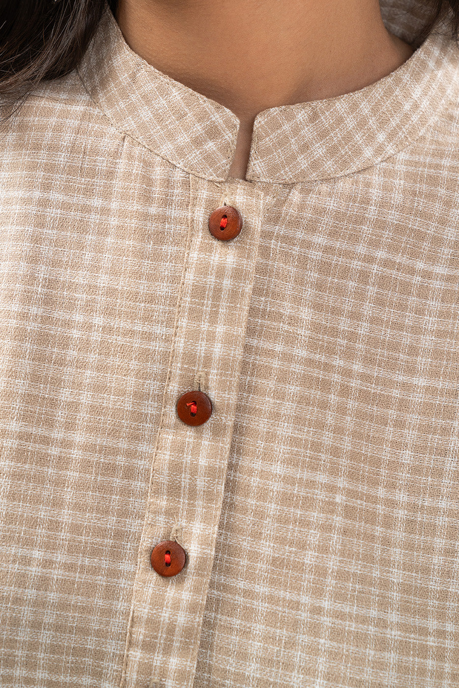 - Description: Basic band collar detail with wooden button detail . embroidery on sleeves paired with culotte pants.