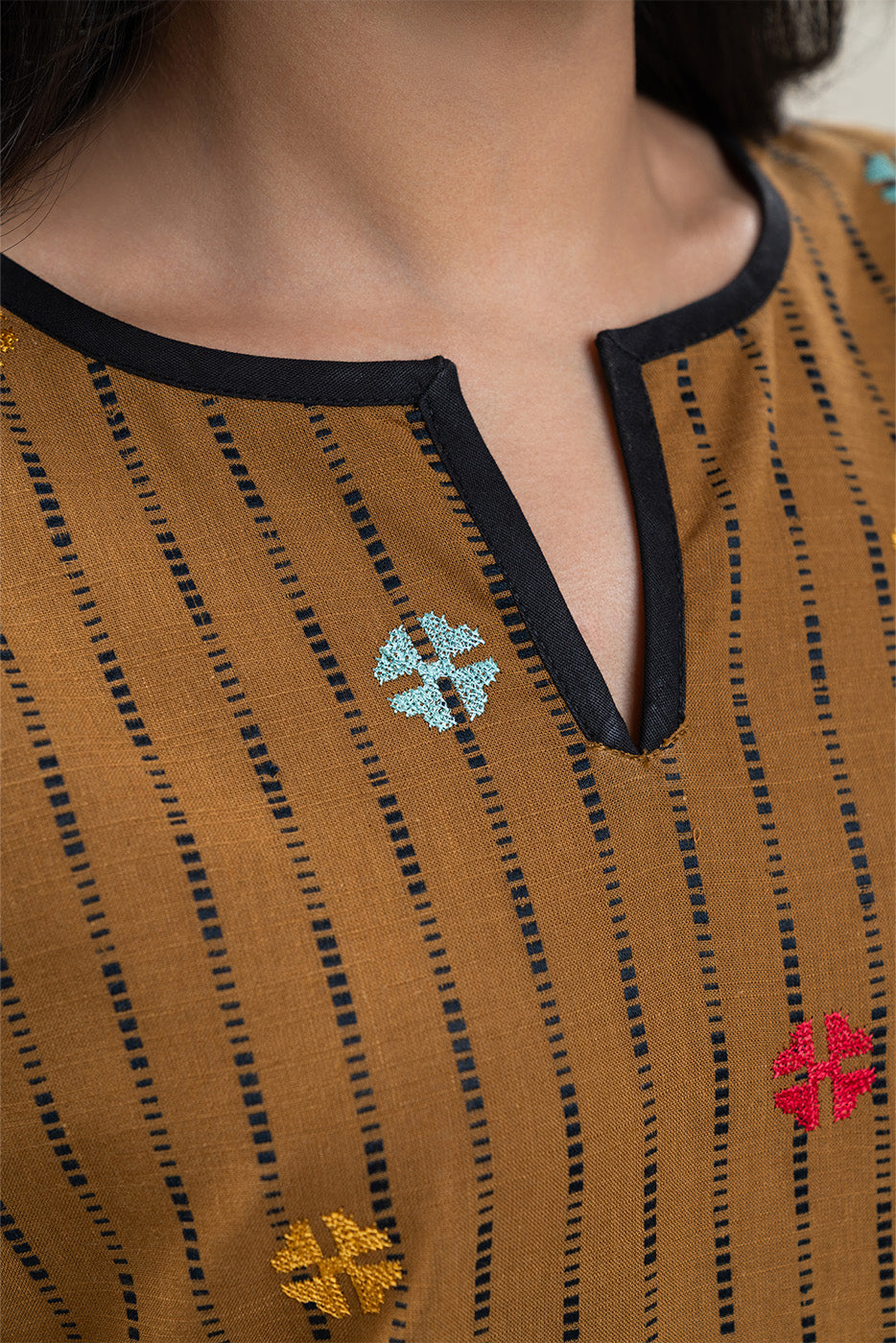 - Description: Embroidered Jacquard Shirt With Round Neckline And V-Slit With Contrasting Trim Piping On Front And Sleeves. Paired With Straight Pants To Complete The Look.