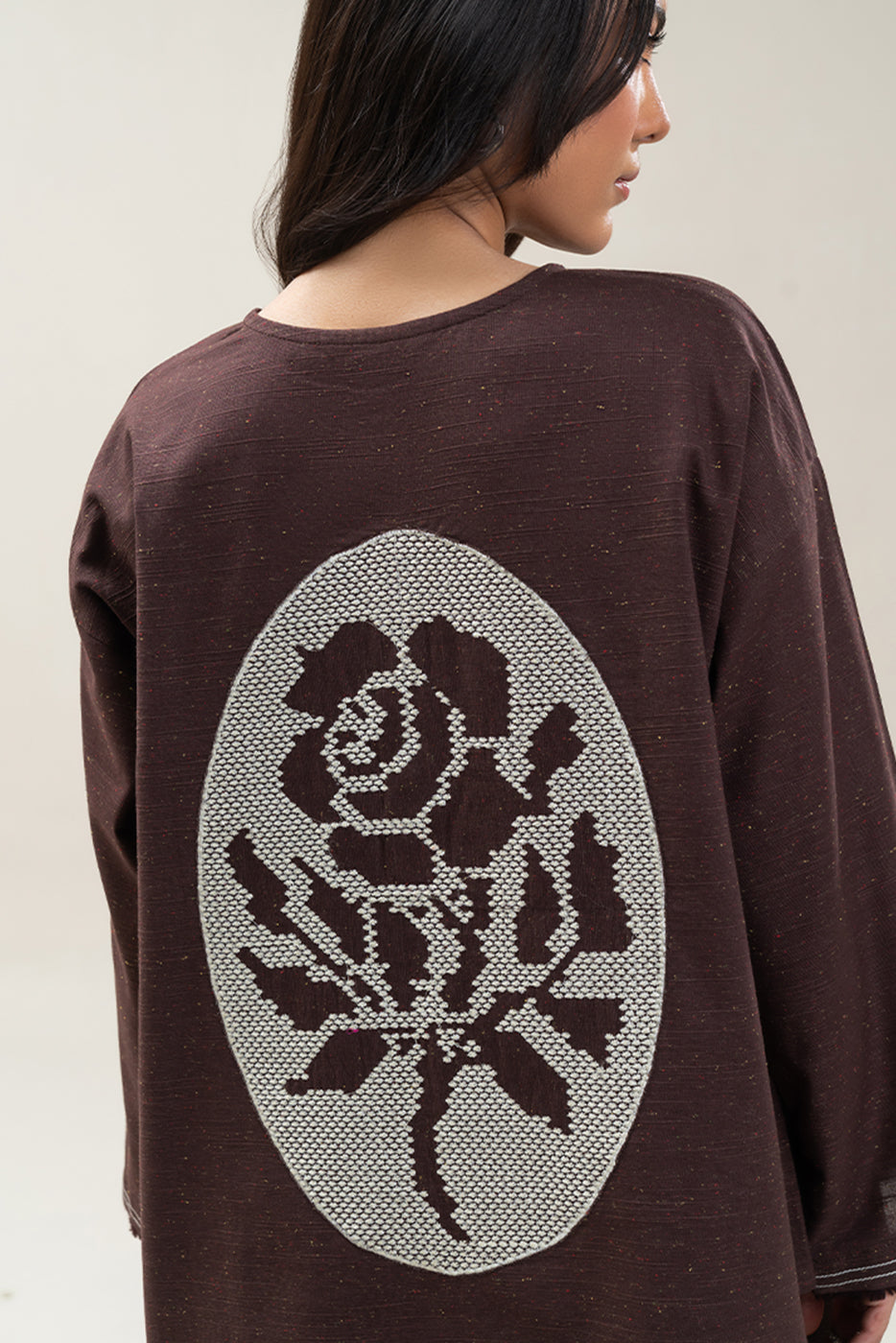 - Description: Embroidered Shirt With Round Neckline And Placket With Button Detail, Contrasting Top Stitches And Frayed Edging Detail On Front And Sleeves, And Embroidered Motif On Back. Paired With Straight Pants To Complete The Look.