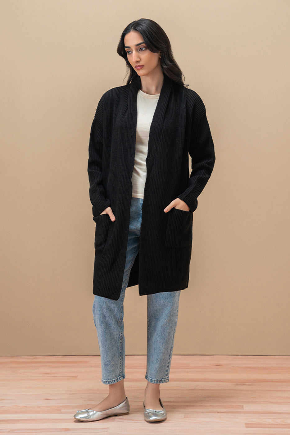 - Description: Chunky-Knit Shrug With Shawl Collar, Drop Shoulder And Pockets