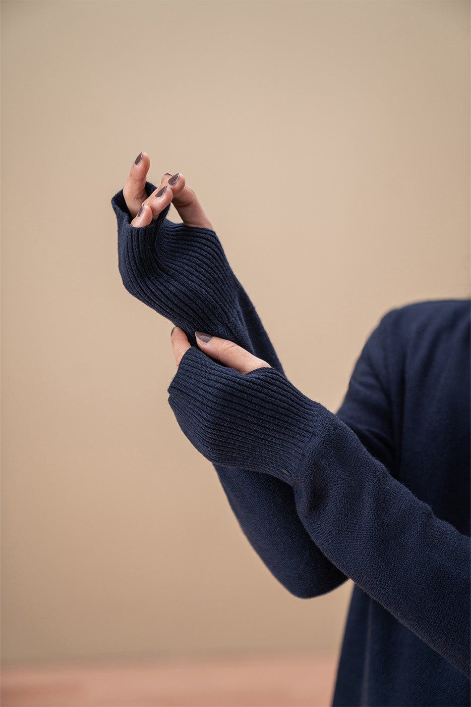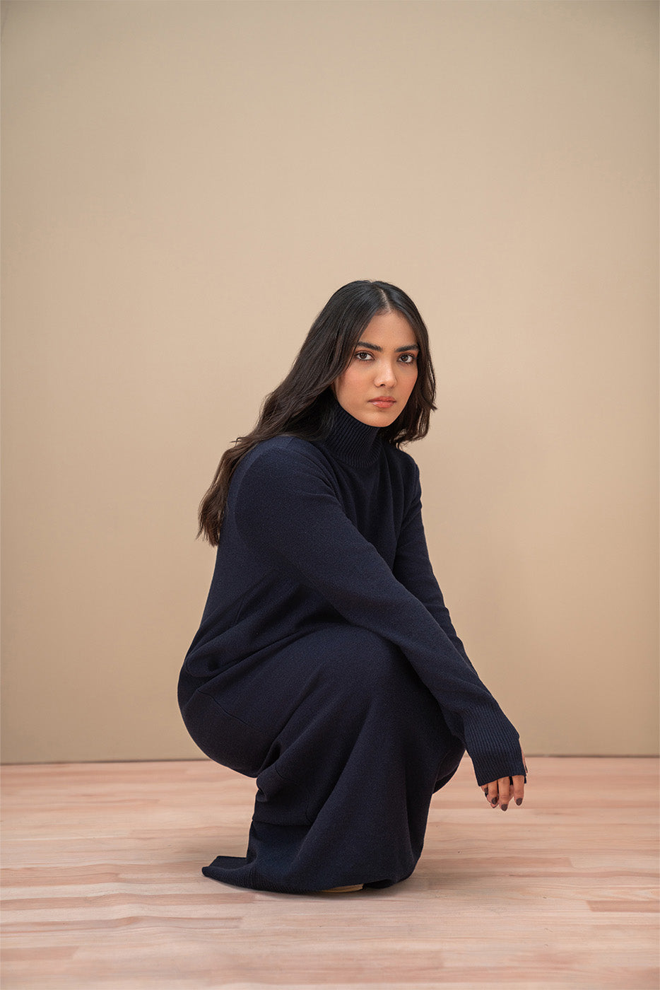 - Description: Long Clean Knit Dress With Slit Detail At Center Back, Extended Thumbhole Detail Sleeves Along With Regular Shoulders
