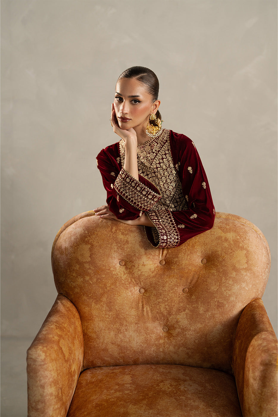 3 PIECE EMBROIDERED VELVET SUIT-GARNET BLISS (UNSTITCHED)