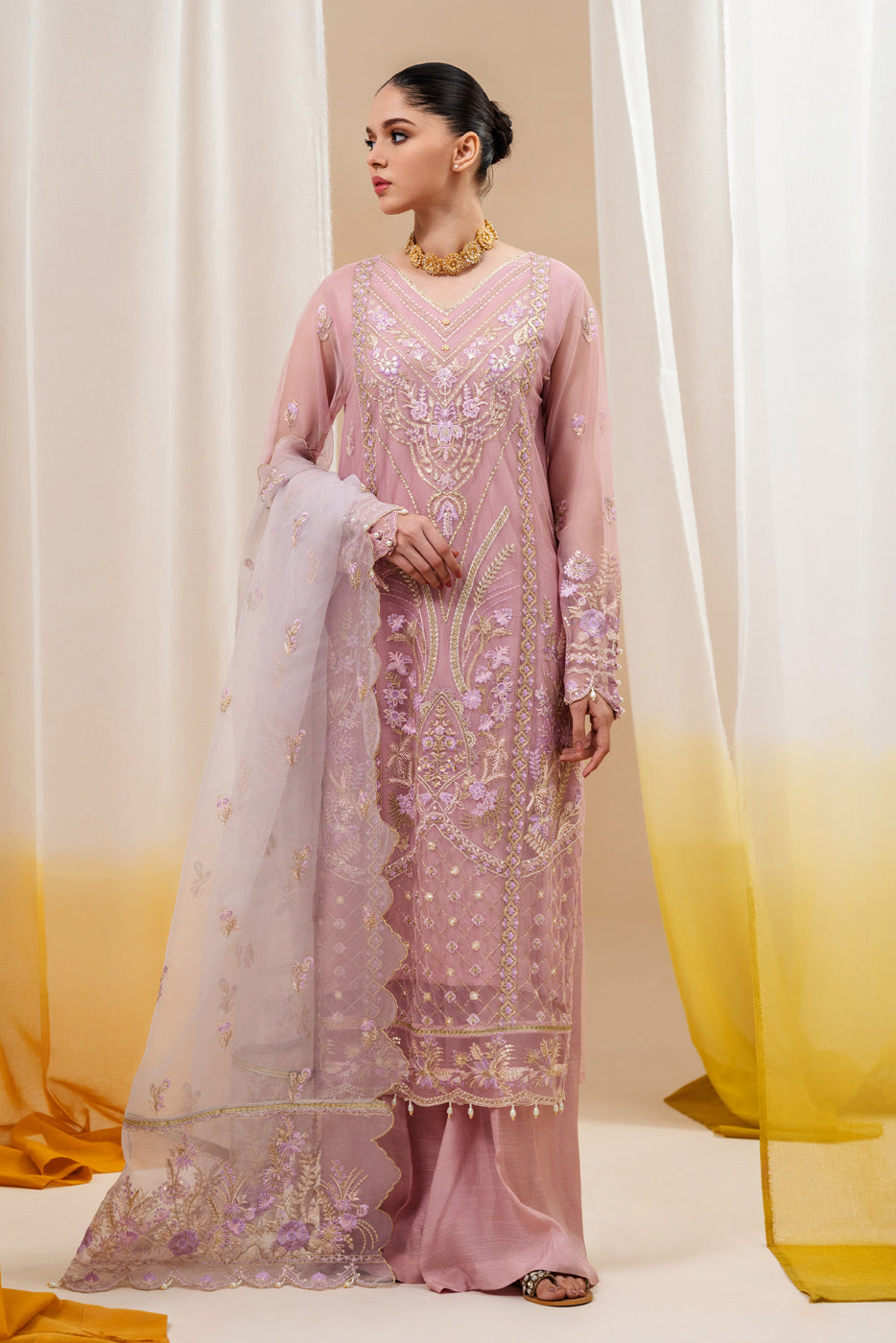 4 PIECE EMBROIDERED ORGANZA NET SUIT-PINK AURA (UNSTITCHED)