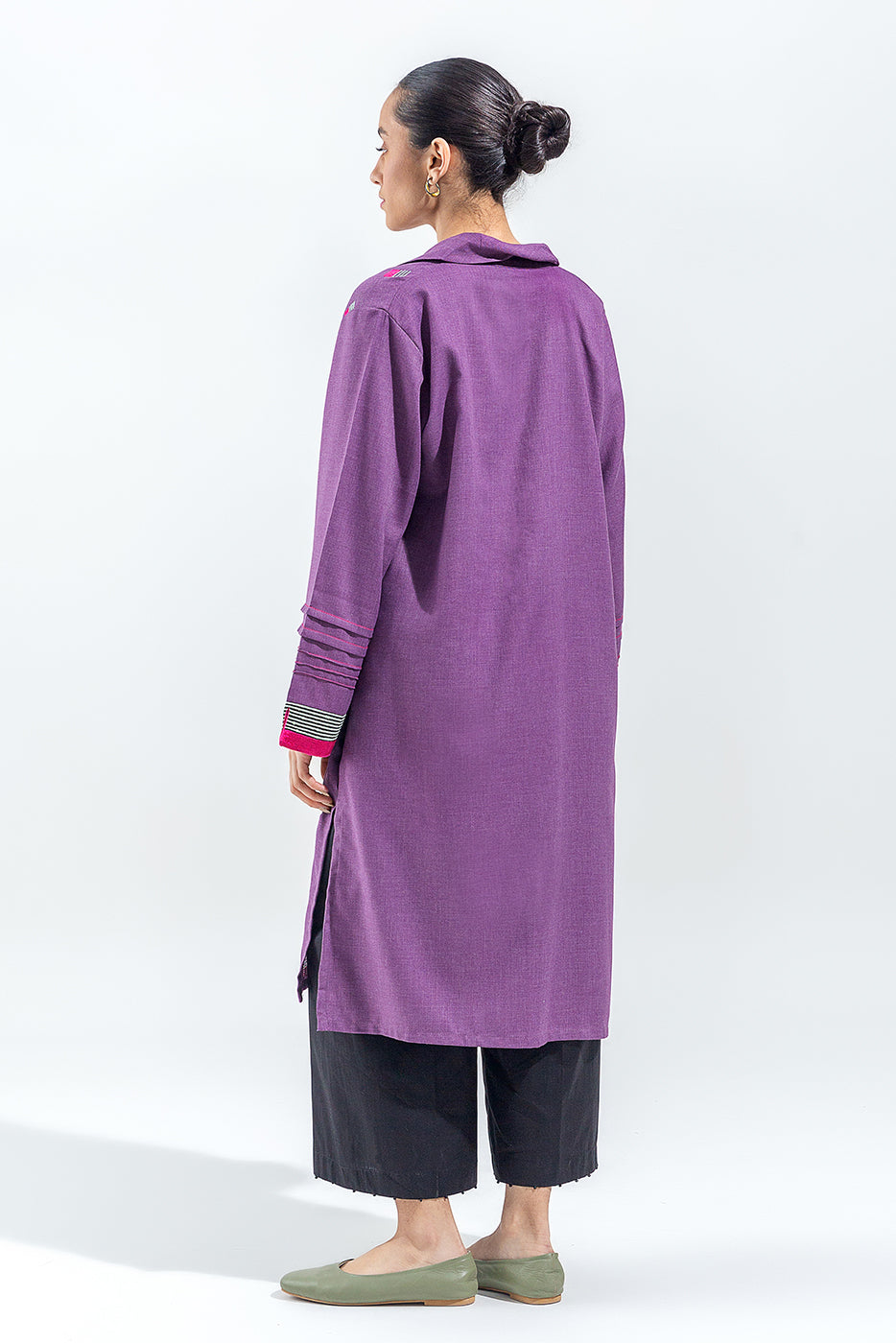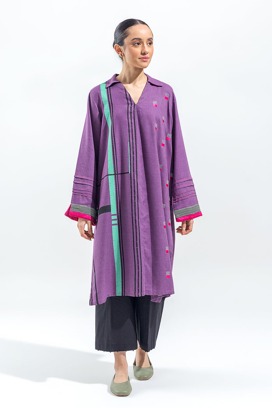 Shirt Collar Tunic With Screen Print And Embroidery On Front. Stitching Detail On Sleeves With Accent Color Trim.