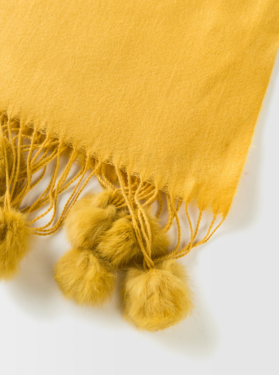 Woolen scarf with pom poms.