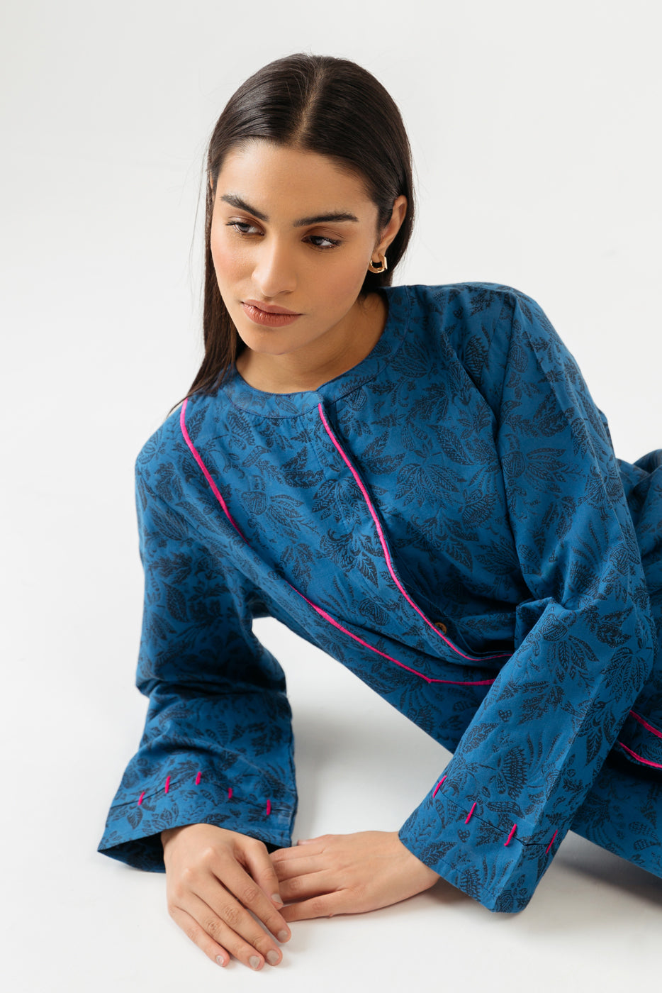 Jacquard Tunic With Band Collar And Double Placket On Front. Accent Color Thread Detail On Front And Sleeves.