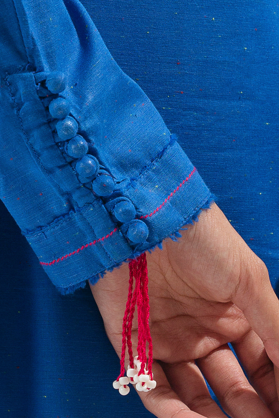 - Description: Basic Shirt With Round Neck And Slit With Loop And Button. Sleeves With Loop And Buttons. Hand Made Tassle On Sleeves. Round Hem.