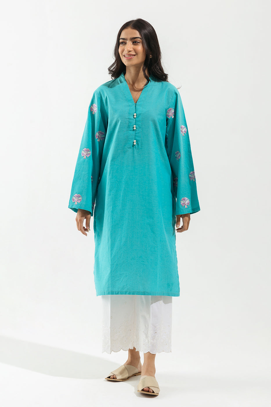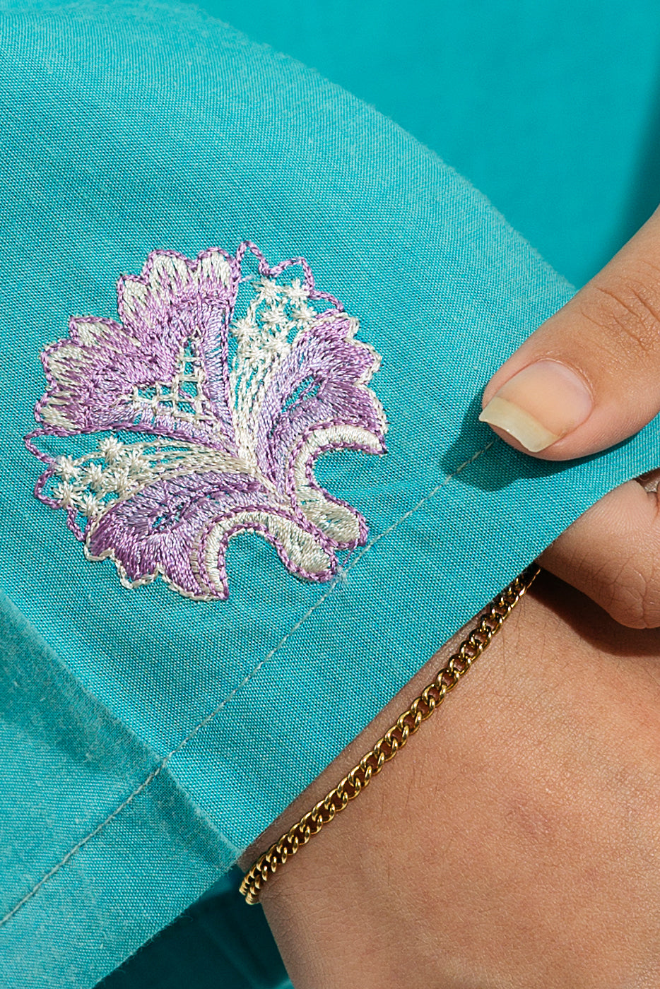 - Description: basic shirt with a V neckline having pearls on the placket and embroidery on sleeves.