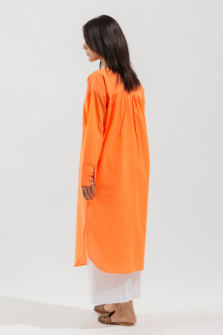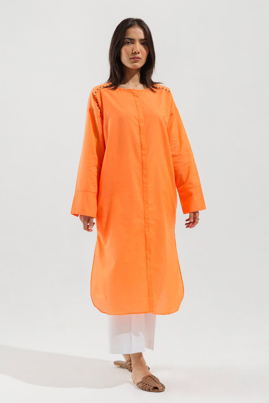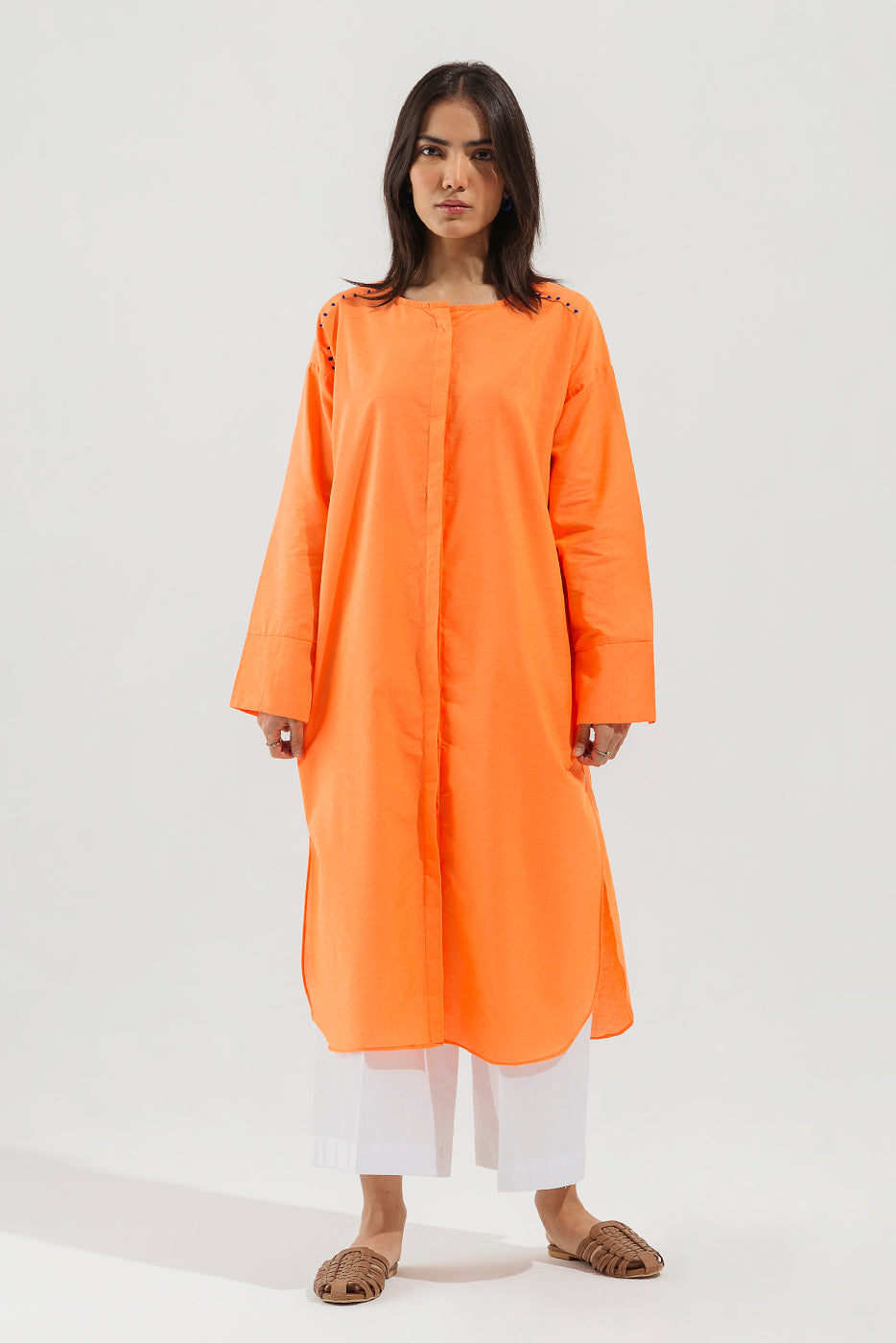 - Description: Solid Tunic With Double Placket And French Knots Detail On Front And Sleeves Cuff.
