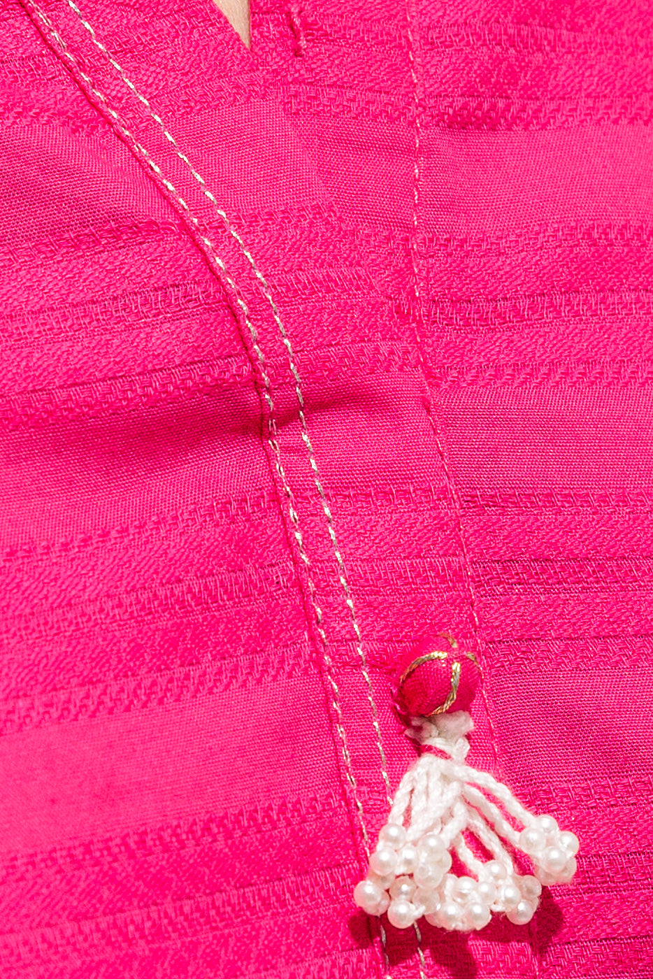 - Description: Basic kurta with band neck and placket. Silver tilla top stitches on neckline and sleeves. Tassle detail on placket. Round hem.