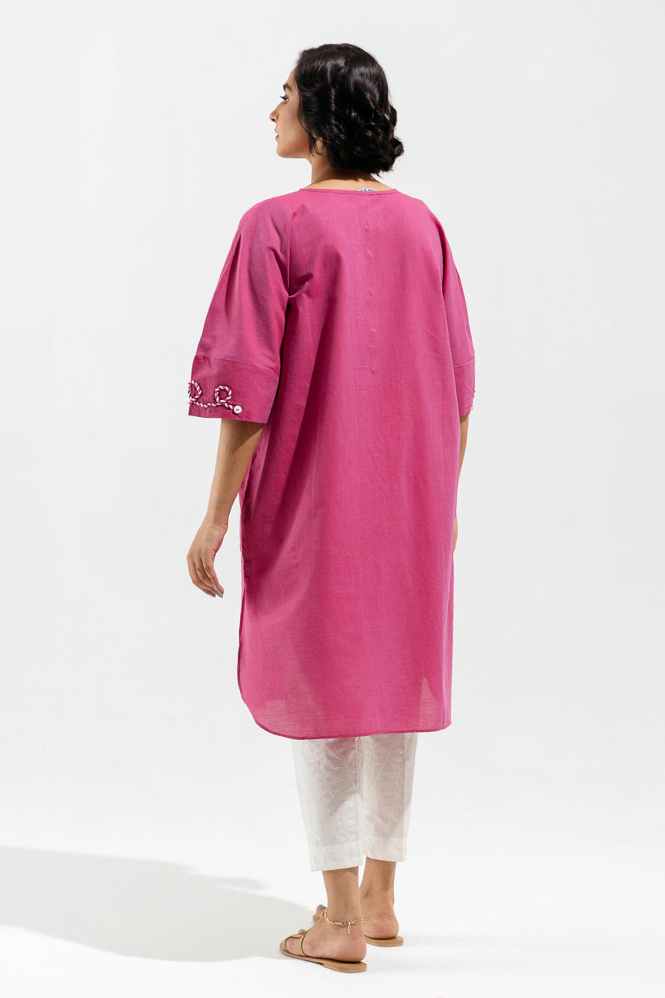 - Description: Basic shirt with boat neck and placket. Button detail on placket. Hand embellishment on sleeves. Round hem.