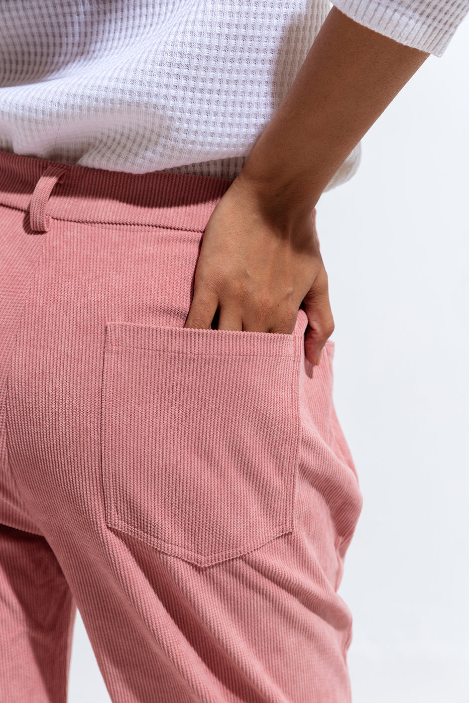 - Description: Light Pink Corduroy wide leg pants with plain waist belt and side pockets.