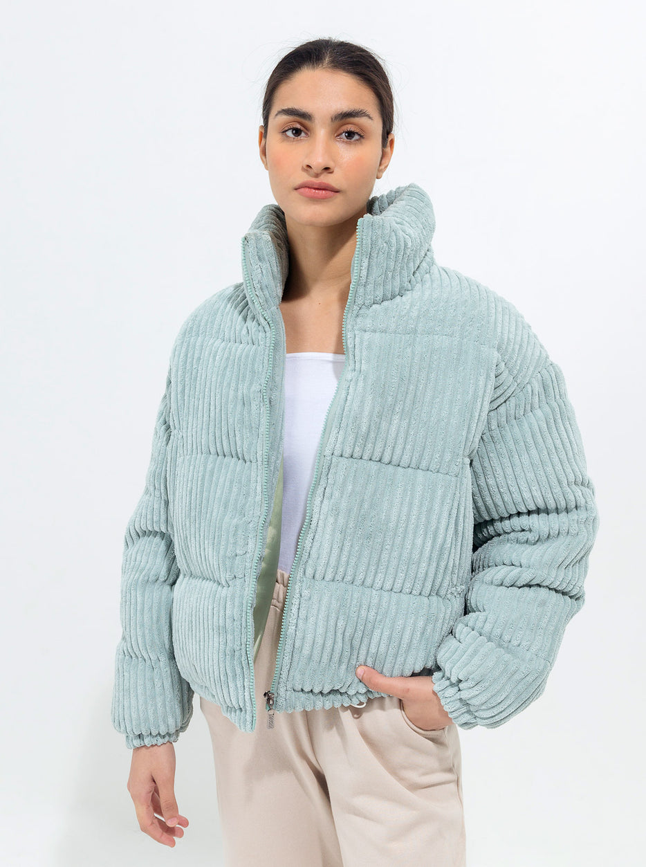 Quilted Jacket With High Neck, Front Zipper And Full Sleeves. Fabric: Corduroy Velour