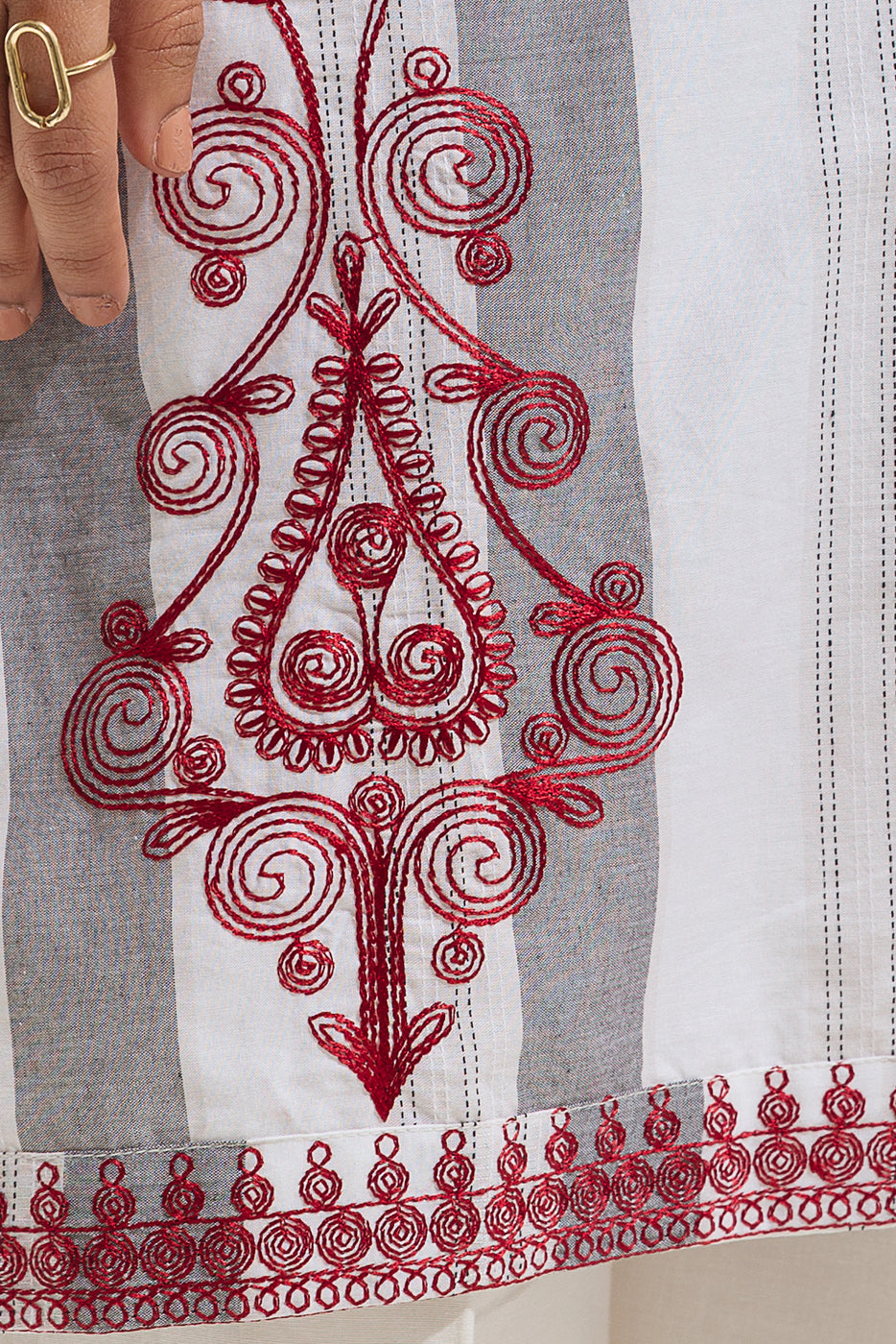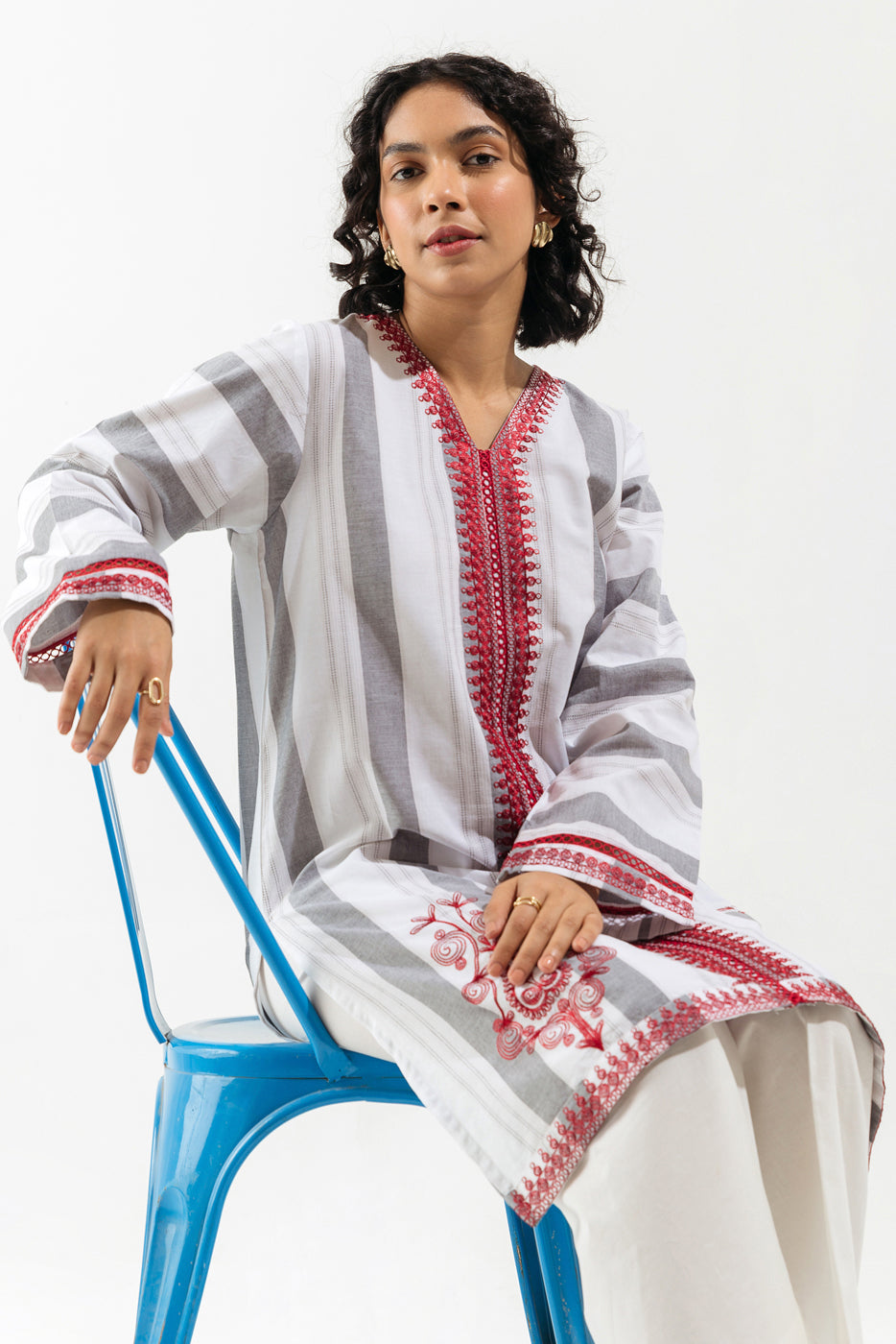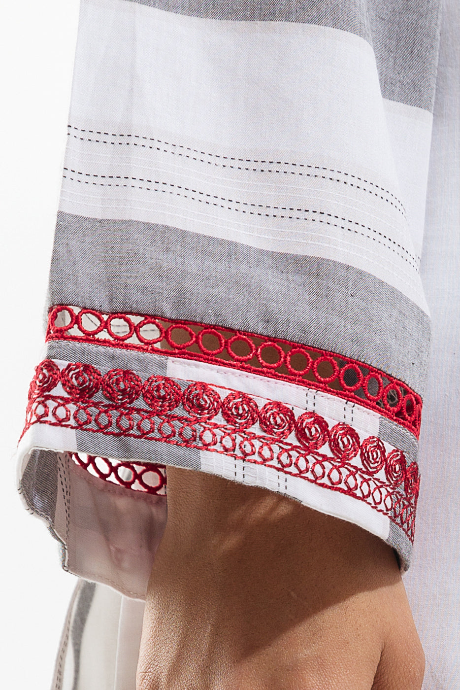 - Description: Basic shirt with embroidered V-neckline with lace insert on centre front, embroidery on hem, and pleated border with handwork and embroidery on sleeves with lace insert.