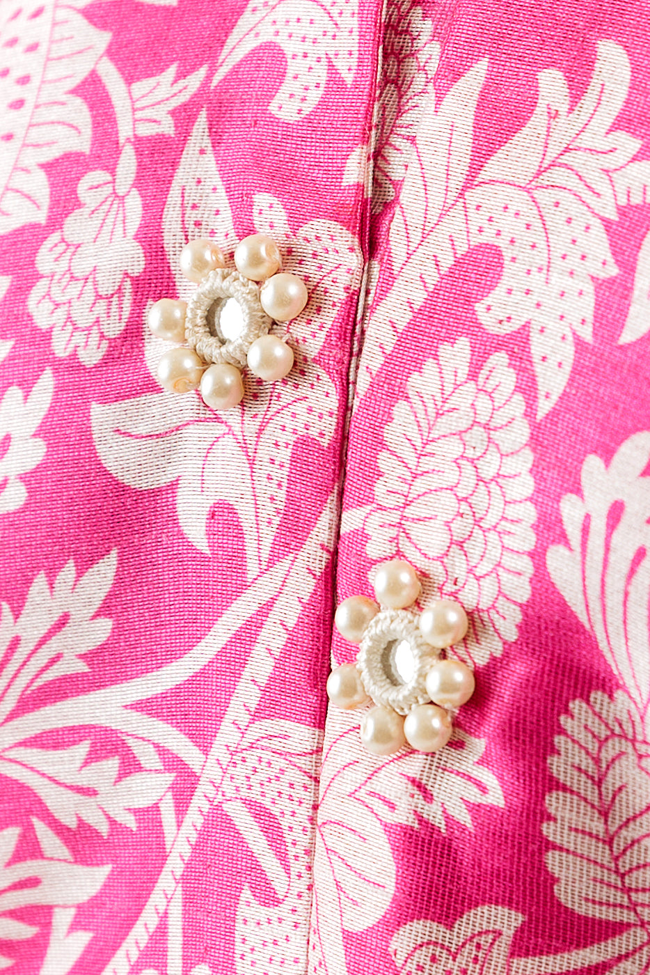 - Description: Loose Extended Shoulder High-Low Cut Printed Shirt With Accent Printed Borders With Pearl Button Detail On Front.