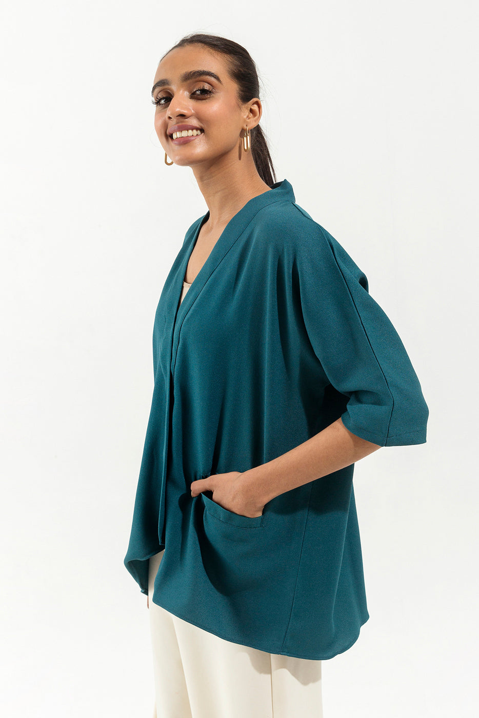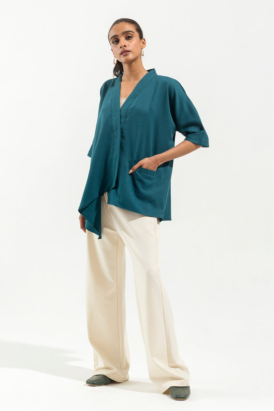 - Description: Blue Diagonal Hi-Low Top With Shawl Collar, Patch Pocket And Batwing Sleeves.