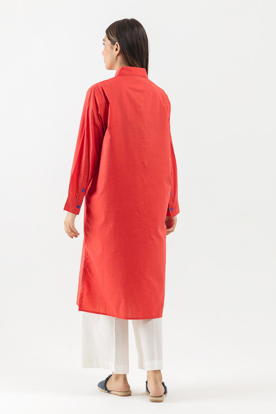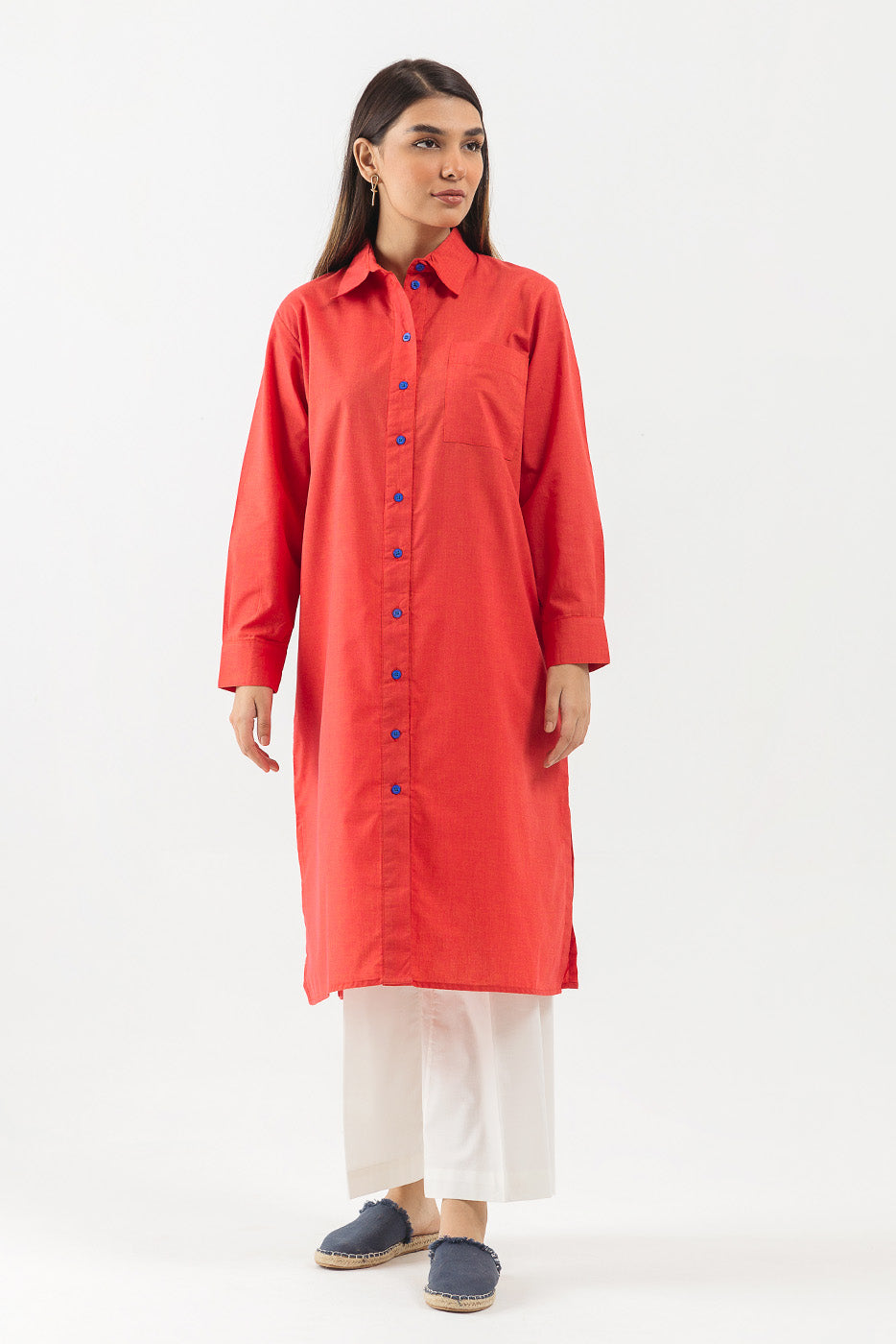 - Description: Collared Shirt With Contrast Blue Button Detail On Front Pocket And Cuffs.