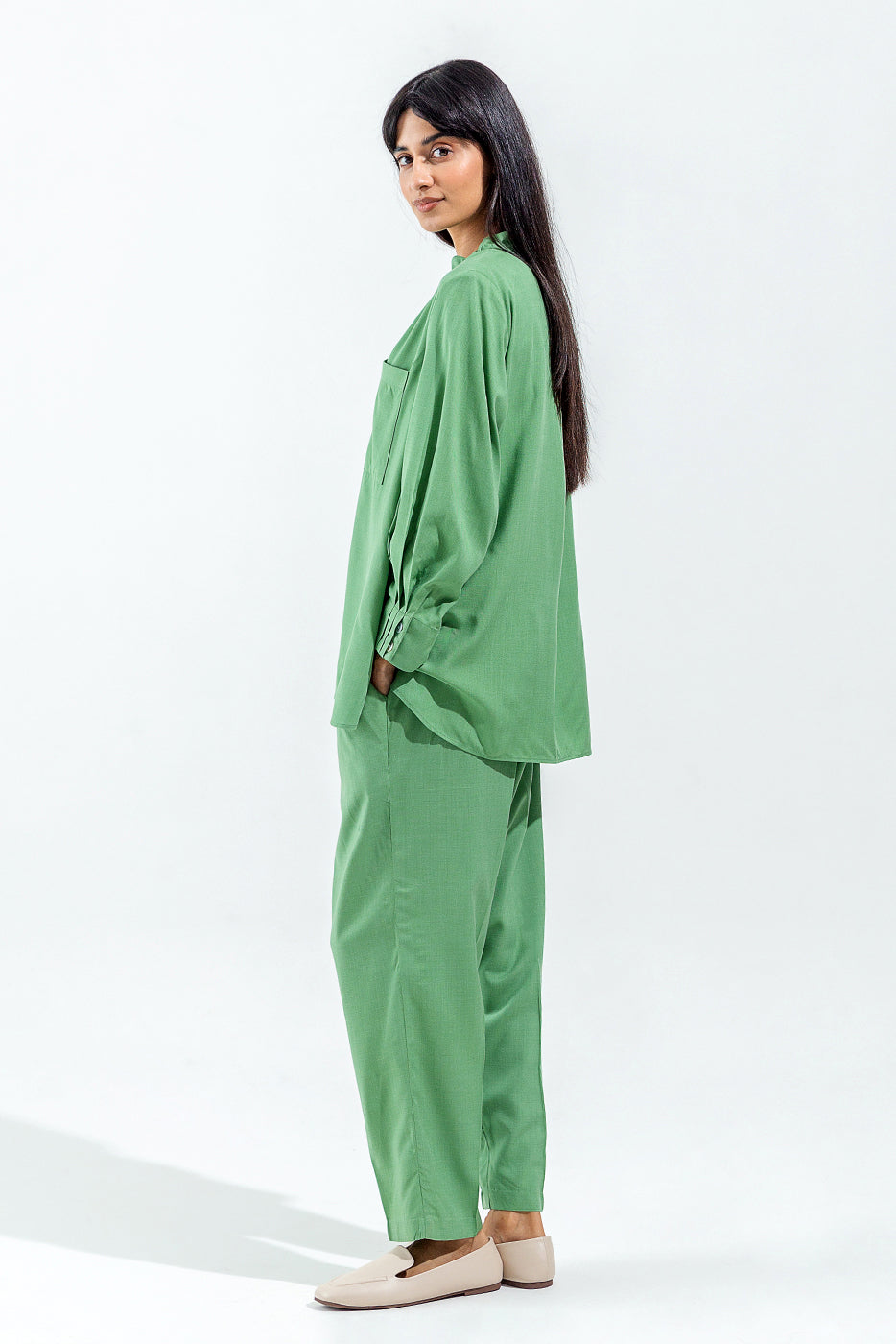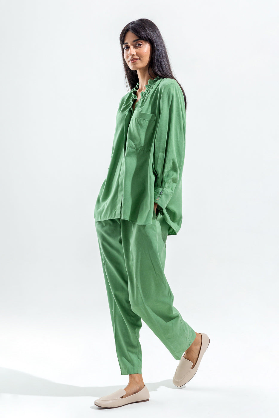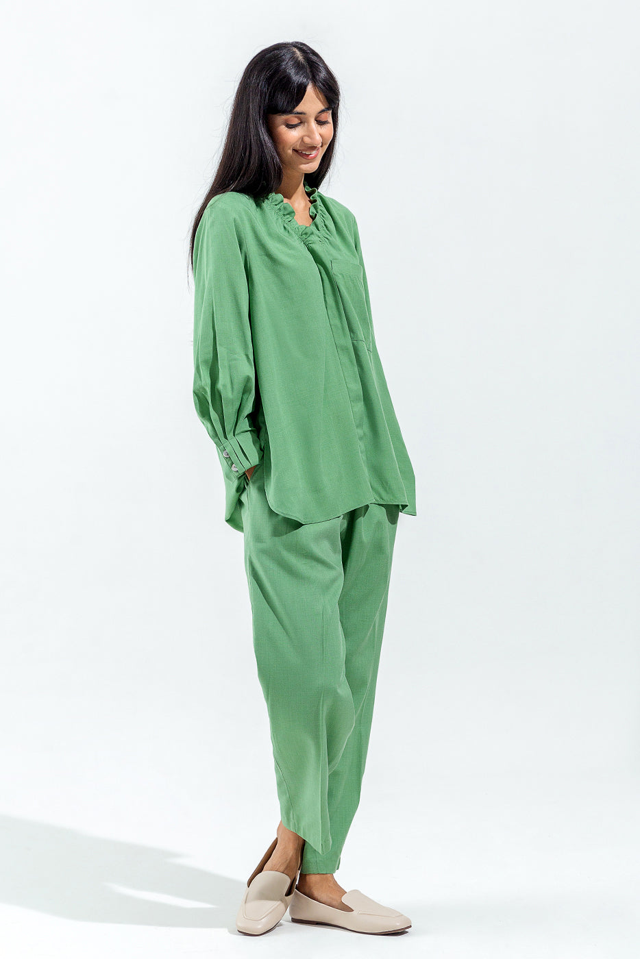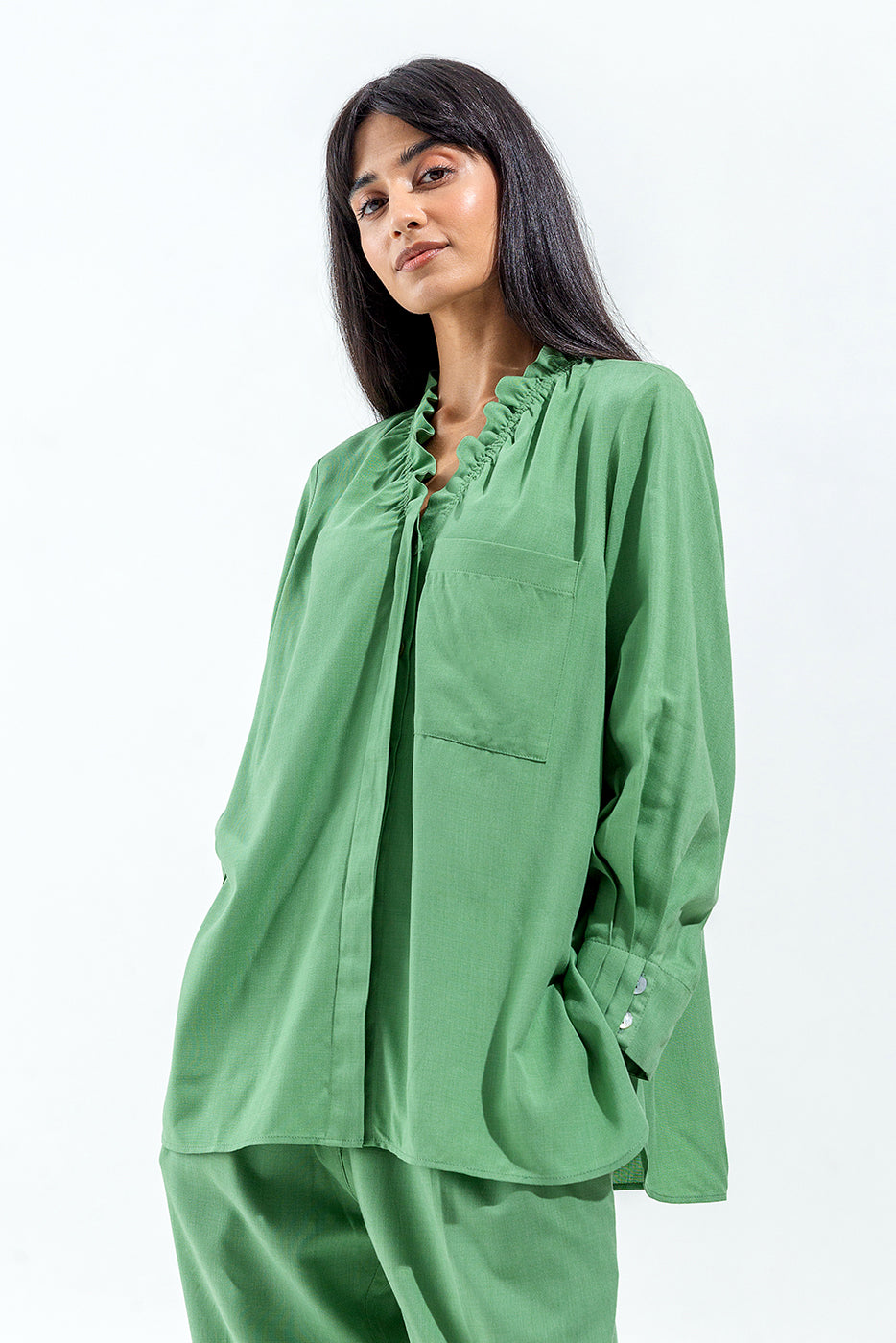 - Description: Green Button-Though Shirts With Hidden Placket, Frill V Neckline, Pleated Below Elbow Sleeves With Side Slits At Hem.