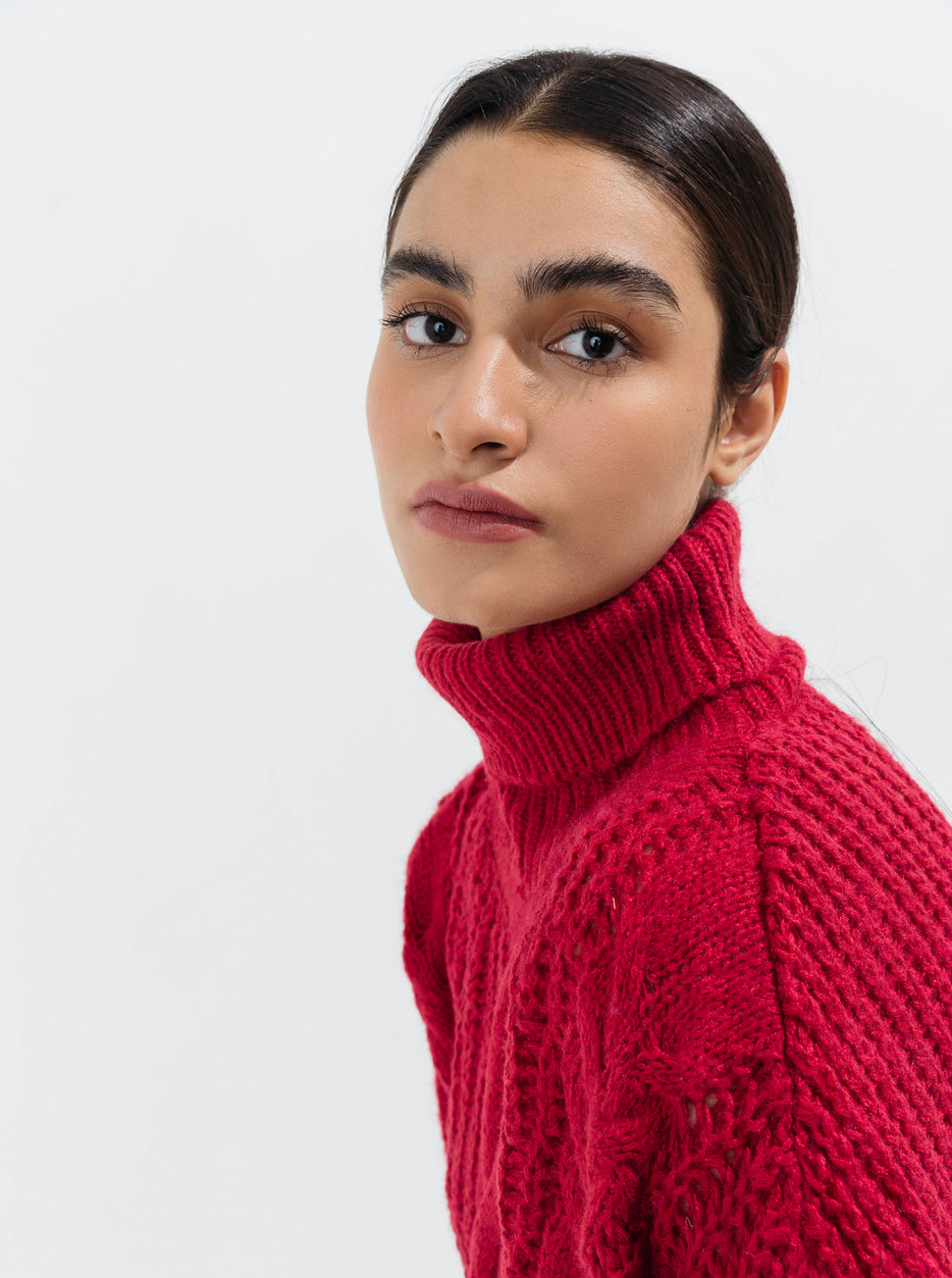 Short purl cable knit pullover with turtle neck, drop shoulders, full sleeves with rib cuffs and hem Fabric:Ì?Ì?́‰ÛÓÌöÌ?ÌÇÌ?Ì?Ì?ÌÇ?Ì?ÌÇÌ?è ?60%polyamide 25%acrylic 15%woolÌ?Ì?́‰ÛÓÌöÌ?ÌÇÌ?Ì?Ì?ÌÇ?Ì?ÌÇÌ?è ?