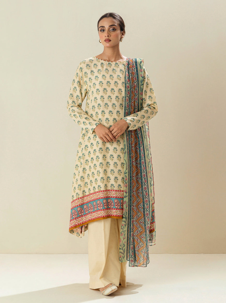 3 PIECE - PRINTED VISCOSE SUIT - LATTE FROTH (UNSTITCHED)